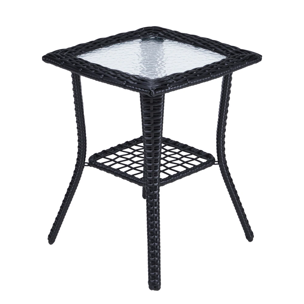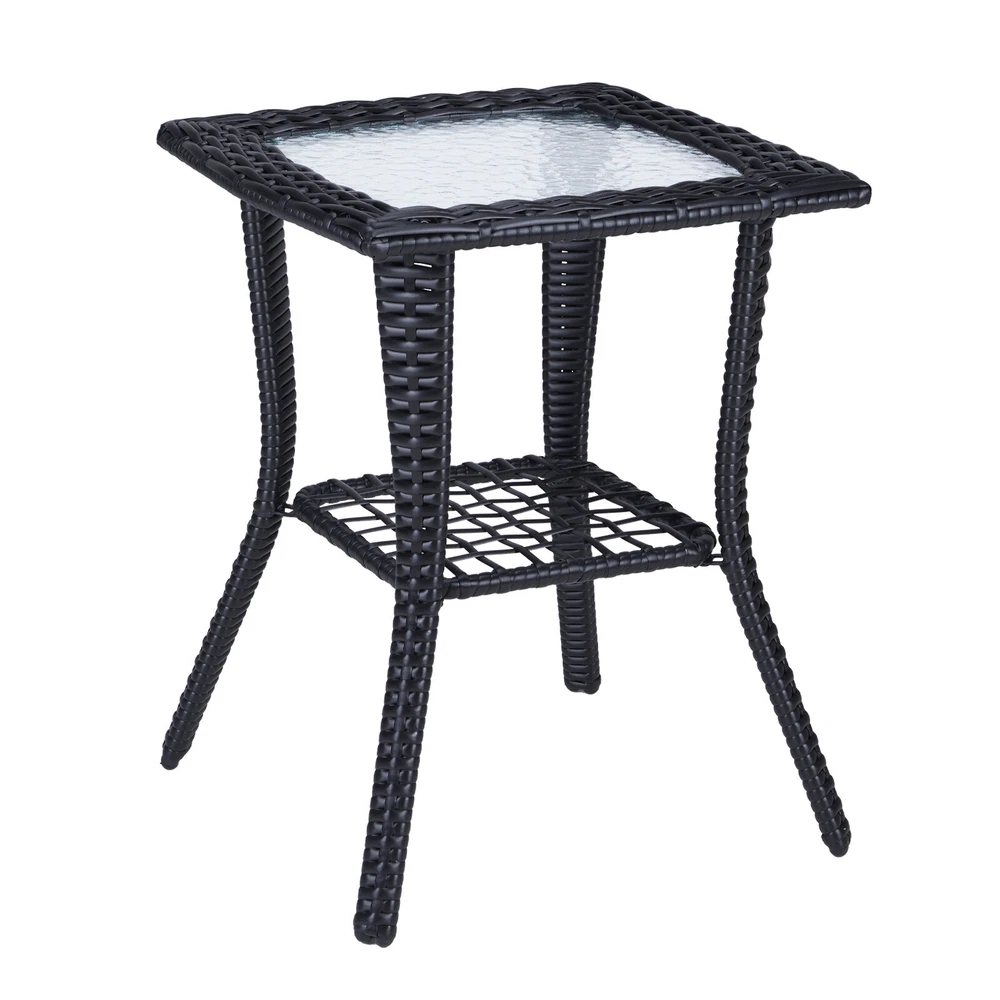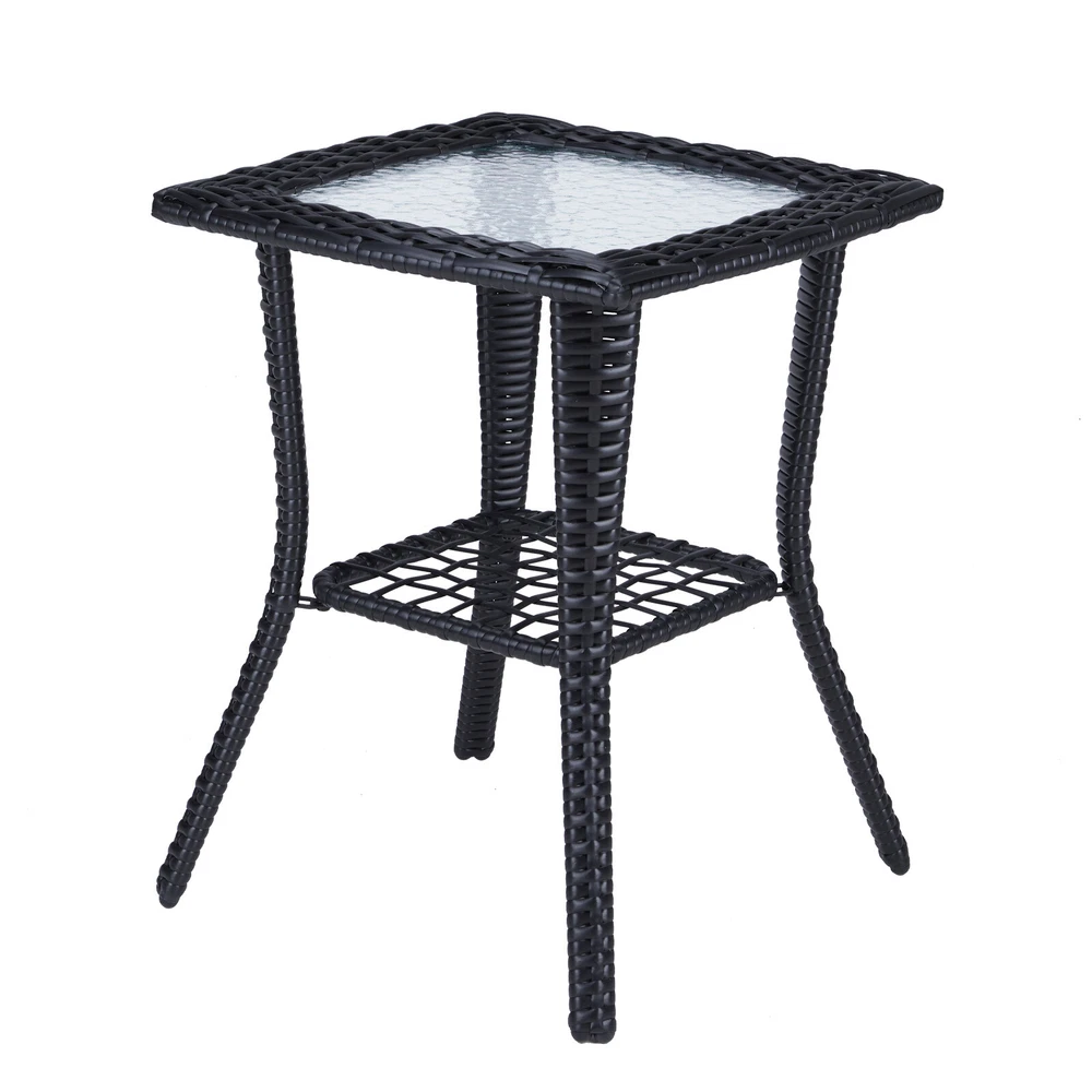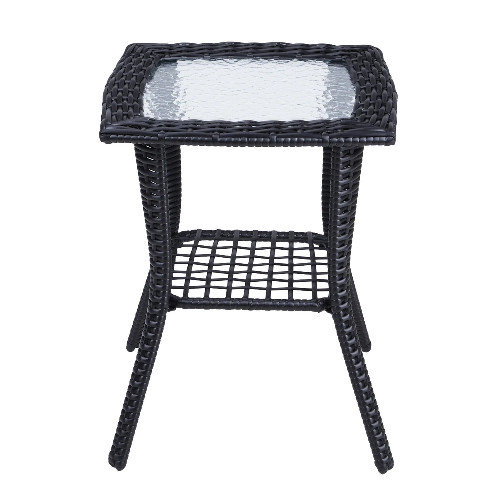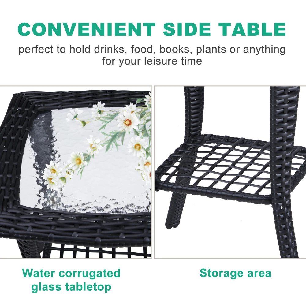 Black Wicker Rattan Side Table with Glass Top for Patio Garden For Indoor