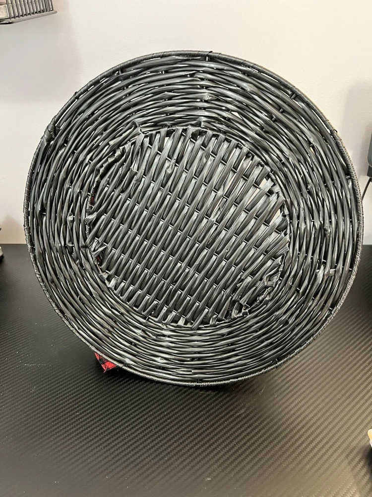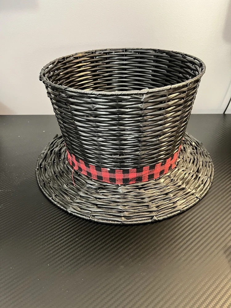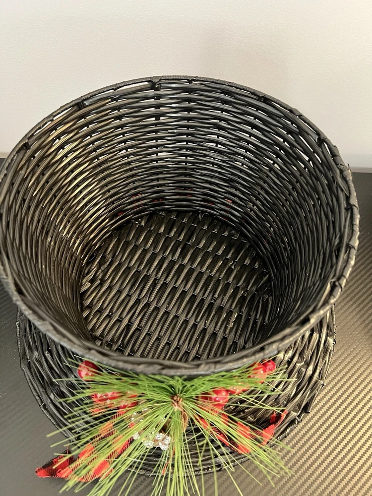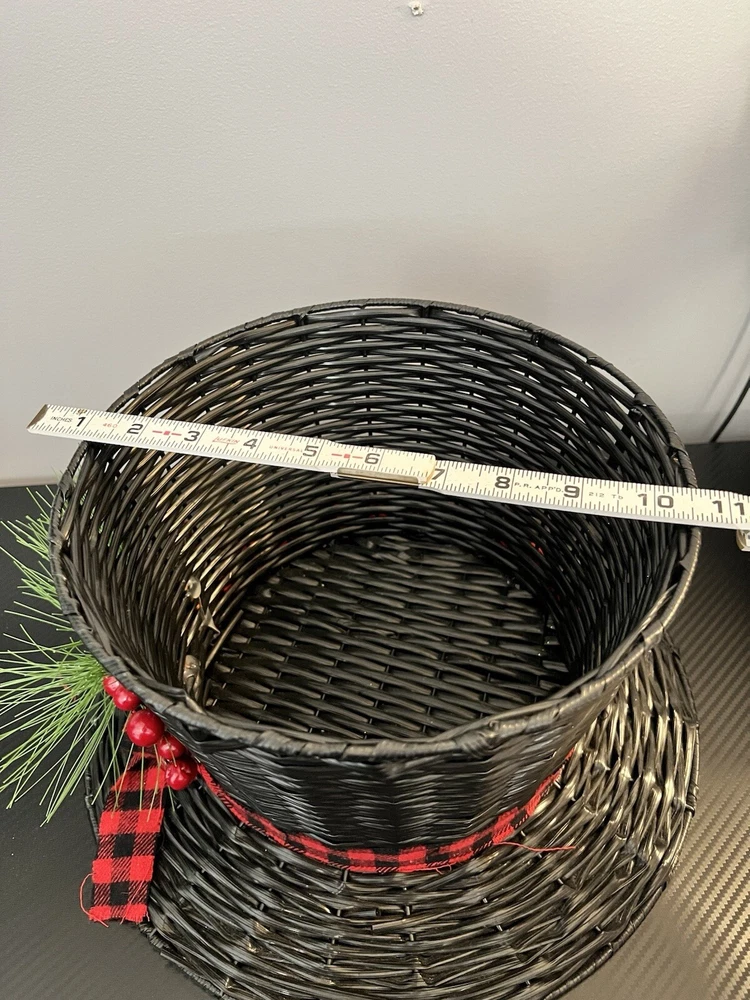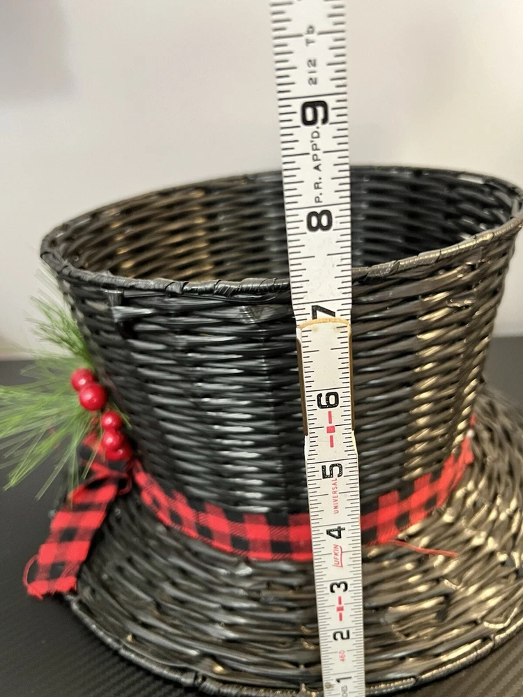 Black Wicker Snowman Hat Planter Display 7” X 13” Red Black Sash W/ Pine Accent good pre-owned condition - no flaws noticed