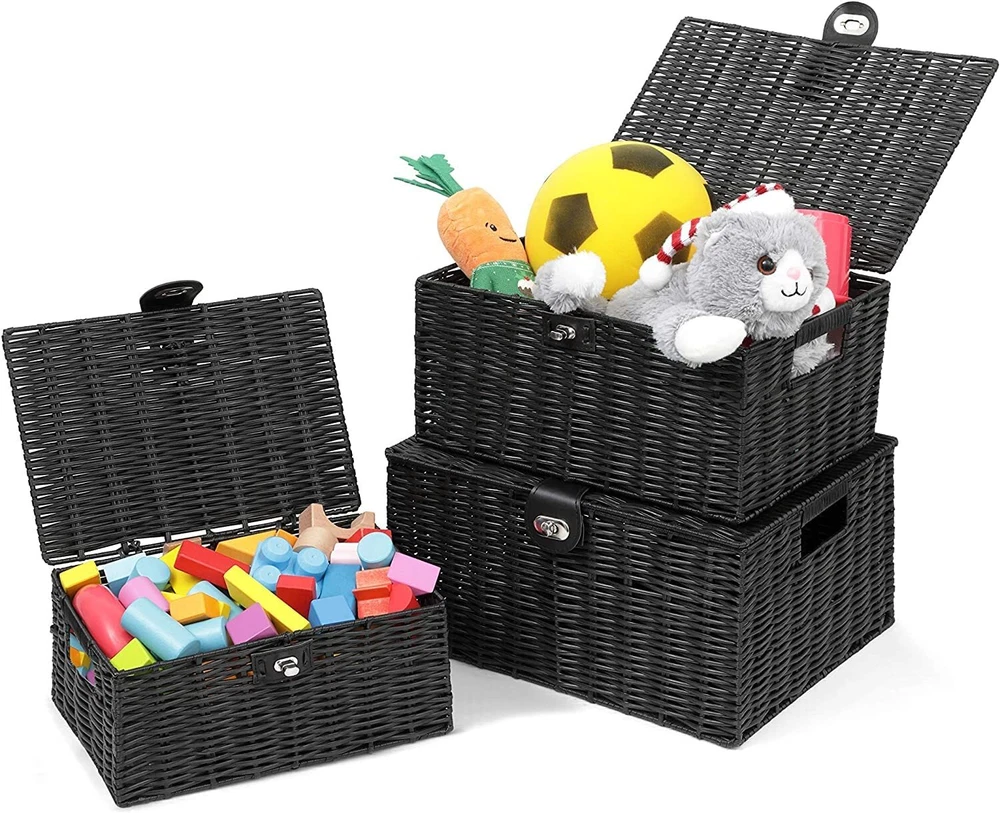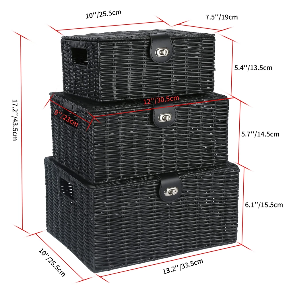 ๐๐น๐ฎ๐๐๐ถ๐ฐ & ๐๐๐๐ฟ๐ฎ๐ฐ๐๐ถ๐๐ฒ ๐ฉ๐ฒ๐ฟ๐๐ฎ๐๐ถ๐น๐ฒ ๐๐ฎ๐บ๐ฝ๐ฒ๐ฟ๐ - Large Wicker Basket with Lid adds a modern contemporary style look to Home Household Dรฉcor. Ideal for bathroom, bedroom, kitchen, living room and other places to use. It is not only an amazing decoration, but also a versatile storage boxes with locks ๐๐ฎ๐๐ต๐ถ๐ผ๐ป๐ฎ๐ฏ๐น๐ฒ ๐ฆ๐๐๐น๐ถ๐๐ต ๐๐ฟ๐ ๐๐ฒ๐ฐ๐ผ๐ฟ - The fashionable, chic woven style of the rectangular woven baskets mean that organizing your stuffs doesnโt have to be an ugly feat, with a leather-look strap and metal lock for that sleek, premium quality storage bins ๐ฆ๐๐ฝ๐ฒ๐ฟ ๐ฆ๐๐๐ฟ๐ฑ๐ & ๐๐๐ฟ๐ฎ๐ฏ๐น๐ฒ ๐ช๐ผ๐๐ฒ๐ป ๐ช๐ถ๐ฐ๐ธ๐ฒ๐ฟ - Made of metal frame which is sturdy, durable and long lasting, the lids basket are attractive and well made, can go with any decor. They are not also as much a practical tool but also as a piece of art. The basket surface made of wicker but it is smooth and can be easy clean. With Nesting handles make for easy storage on the move ๐๐น๐น-๐ข๐ฐ๐ฐ๐ฎ๐๐ถ๐ผ๐ป ๐ ๐๐น๐๐ถ-๐ฃ๐๐ฟ๐ฝ๐ผ๐๐ฒ ๐ฆ๐๐ผ๐ฟ๐ฎ๐ด๐ฒ - Available in a versatile grey woven basket, they are suitable for use in a variety of room in your home, securely storing anything from kidโs toys to food, books to bathroom toiletries, bedroom to kitchen, living room to entry way. With three different large/medium/small sizes, you can use in stylish stacked form or as storage in different room around the house ๐ฆ๐ฒ๐ ๐ผ๐ณ ๐ฏ ๐๐ฎ๐๐ธ๐ฒ๐ ๐ฆ๐ถ๐๐ฒ - When three different size rectangle baskets not in use, they can stack inside of each other. Large Basket: 14.2"W x 11"D x 7.3"H (36cm x 28cm x 18.5cm) ; Medium Basket: 13"W x 9.5"D x 6.1"H (33cm x 24cm x 15.5cm) ; Small Basket: 11"W x 7.9"D x 4.9"H (28cm x 20cm x 12.5cm)