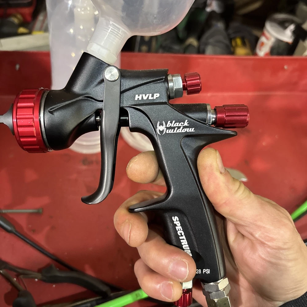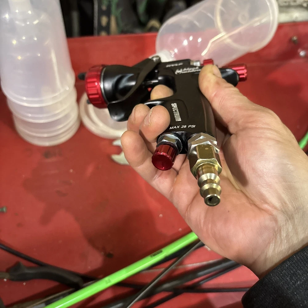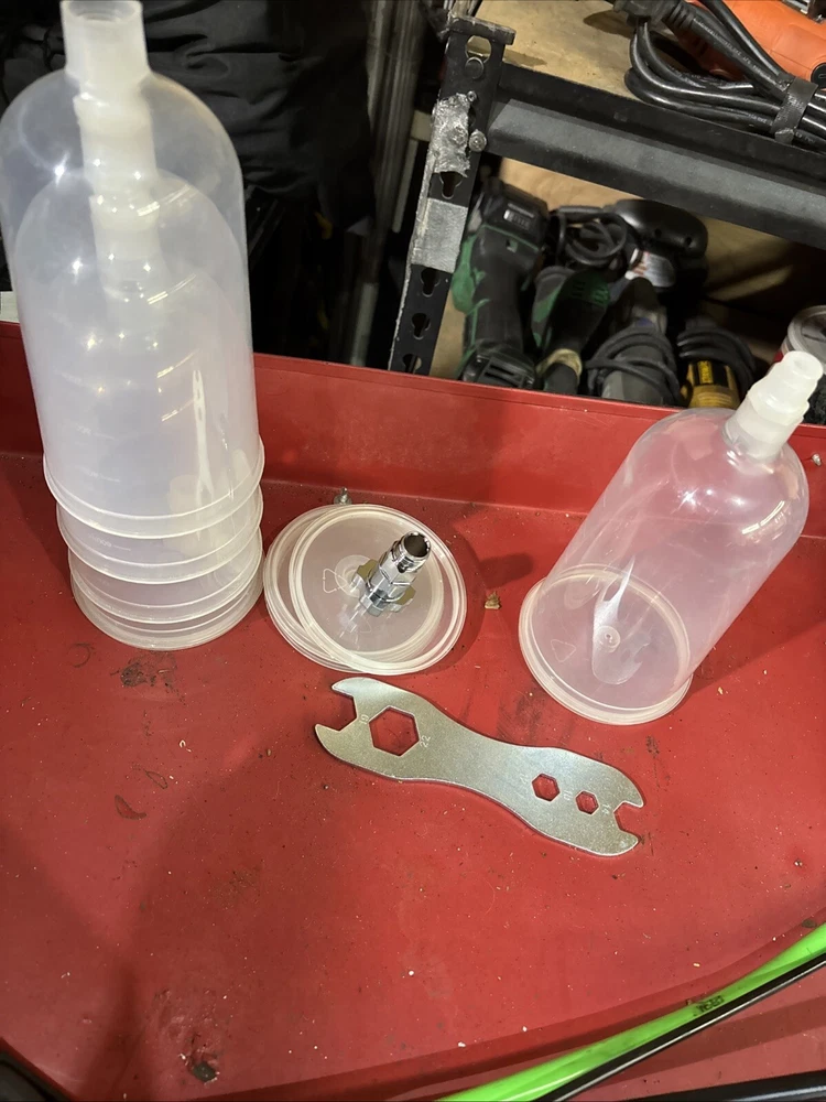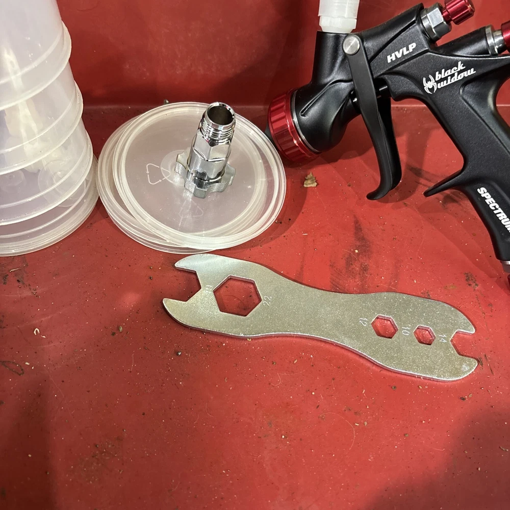 Never used no box also comes with spectrum disposable cups and cup adapter wrench to clean it that comes with the spray gun everything in the pictures