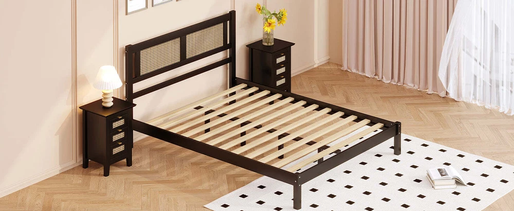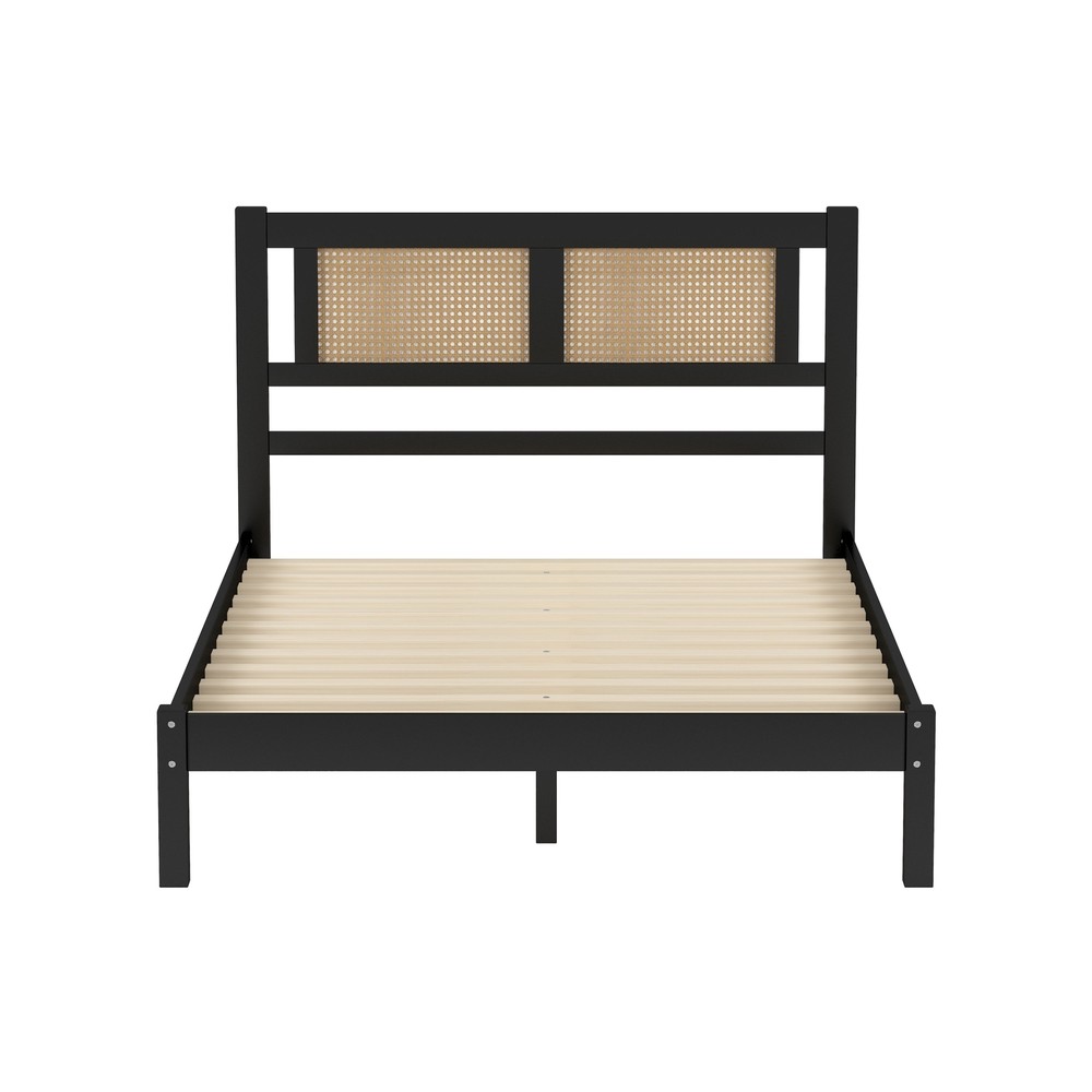 Specifications Place of Origin #originPlace# Main Color Black Main Material Particle Board Dangerous Goods #dangerFlag# Dimensions & Weights Assembled Length (in.) 78.90 Assembled Width (in.) 57.30 Assembled Height (in.) 35.00 Weight (lbs) 50.00 Product Features Natural Rattan Headboard Design : Our headboard features a beautifully woven rattan pattern that brings organic charm and visual interest to your sleep space. The natural tones of the rattan add a warm and earthy feel, creating a serene atmosphere. Contemporary and Minimalist Style:With a focus on clean lines and a minimalist approach, this headboard fits seamlessly into any contemporary bedroom setting. It's an ideal choice for those who appreciate a simple yet sophisticated aesthetic.Whether your bedroom decor leans towards coastal, bohemian, or modern, this rattan headboard fits in effortlessly.Its neutral color and textural design complement a variety of interior styles, making it a versatile addition to any home. High-Quality Wood Craftsmanship: Crafted from high-quality rattan, this headboard is built to last. The natural material is not only visually appealing but also known for its durability and resistance to wear and tear, making it a wise investment for your home. Easy to Assemble: We've made setting up your new headboard straightforward and hassle-free. The included instructions are easy to follow, and all necessary hardware is provided to ensure you can enjoy your new piece quickly and effortlessly. Dimensions: Overall Product Dimension:78.9" x 57.3” x 35"(L x W x H). All parts, tools and instructions are shipped directly to your door for easy assembly. Description Wooden Platform Bed with Rattan Headboard, Exquisite Elegance with Minimalist Charm for Bedroom Transform your bedroom into a tranquil retreat with our Rattan Headboard. This headboard perfectly combines the natural beauty of rattan material with modern design elements, showcasing a subtle and exquisite style that is ideal for those seeking fashion-forward and refreshing bedroom aesthetics. Its minimalist design retains its unique characteristics, adding a touch of nature and warmth to your bedroom while maintaining a contemporary feel. Whether you prefer a cozy beach style, free-spirited bohemian vibes, or a sleek modern look, this rattan headboard will effortlessly enhance the charm of your bedroom. Features: Product Type Platform Bed Color Black Product material Particle board+Plywood+Rattan+Rubber Wood