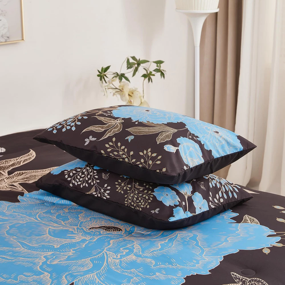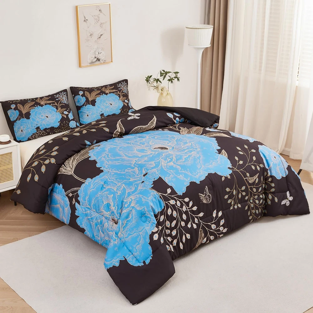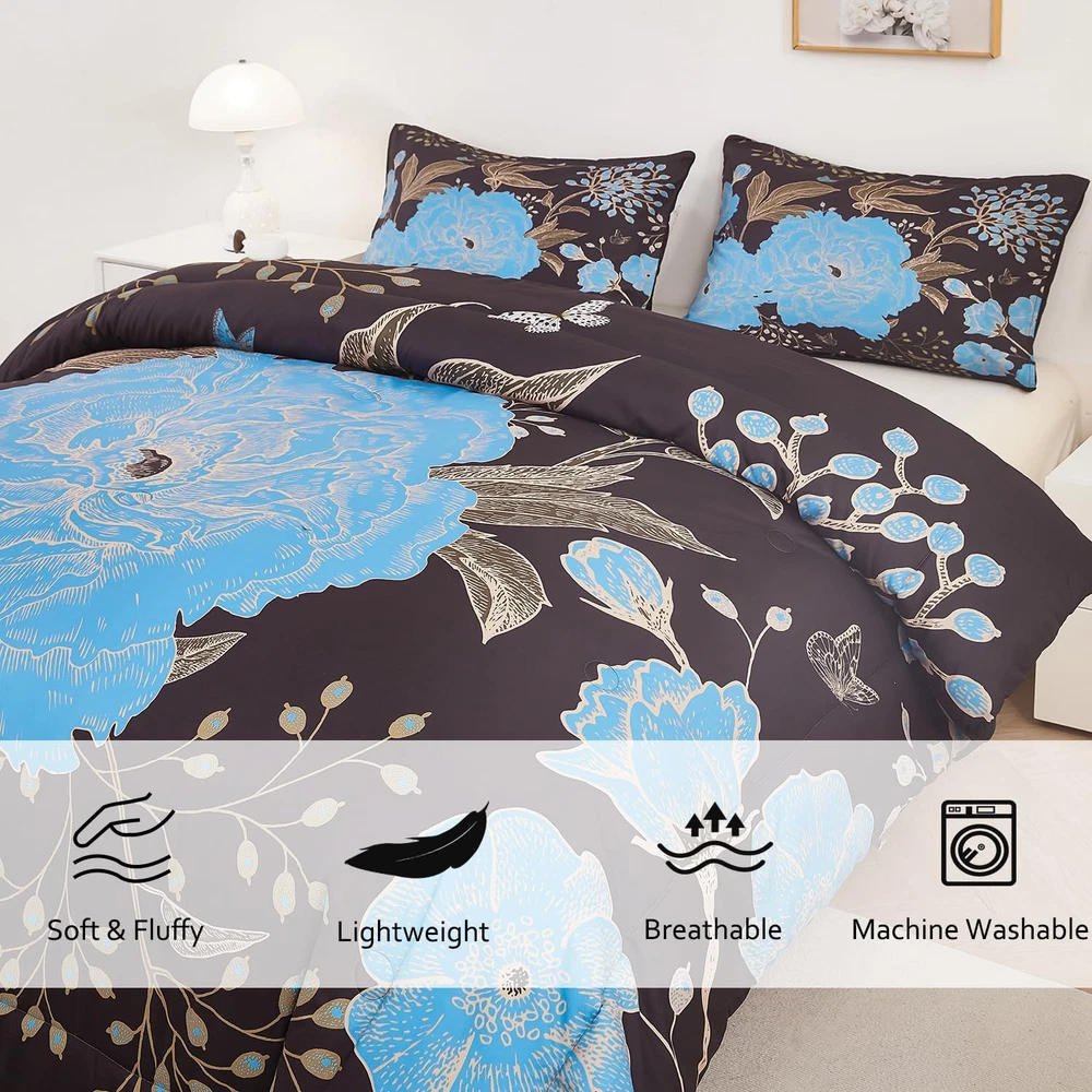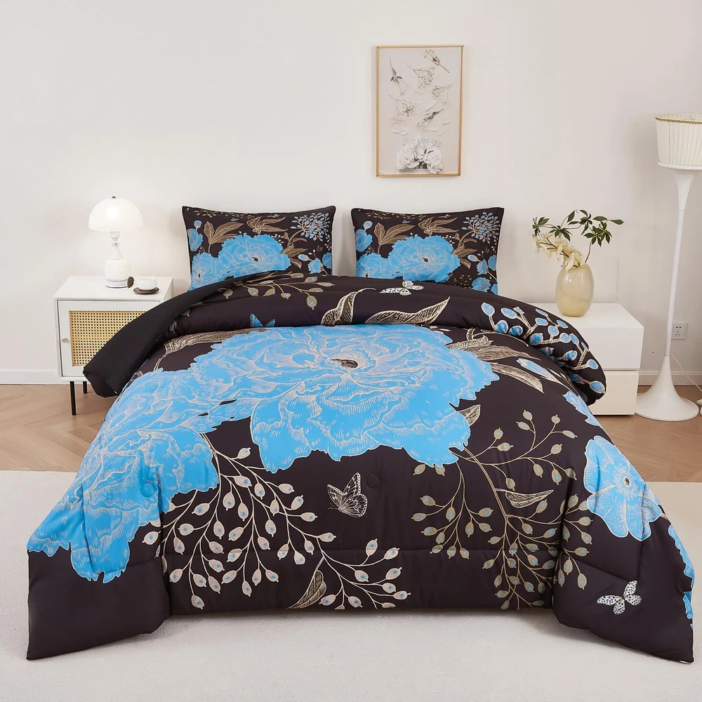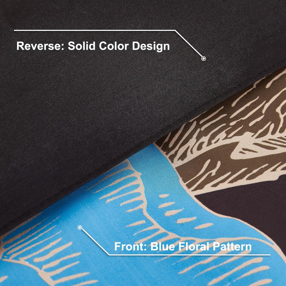 Black and Blue Floral Comforter Set 3 Pieces Queen Size Botanical Bedding Set...