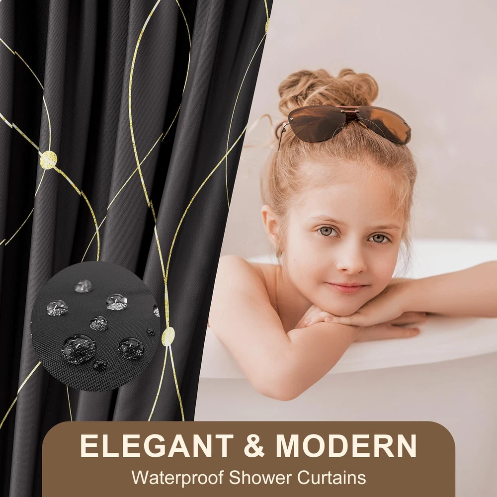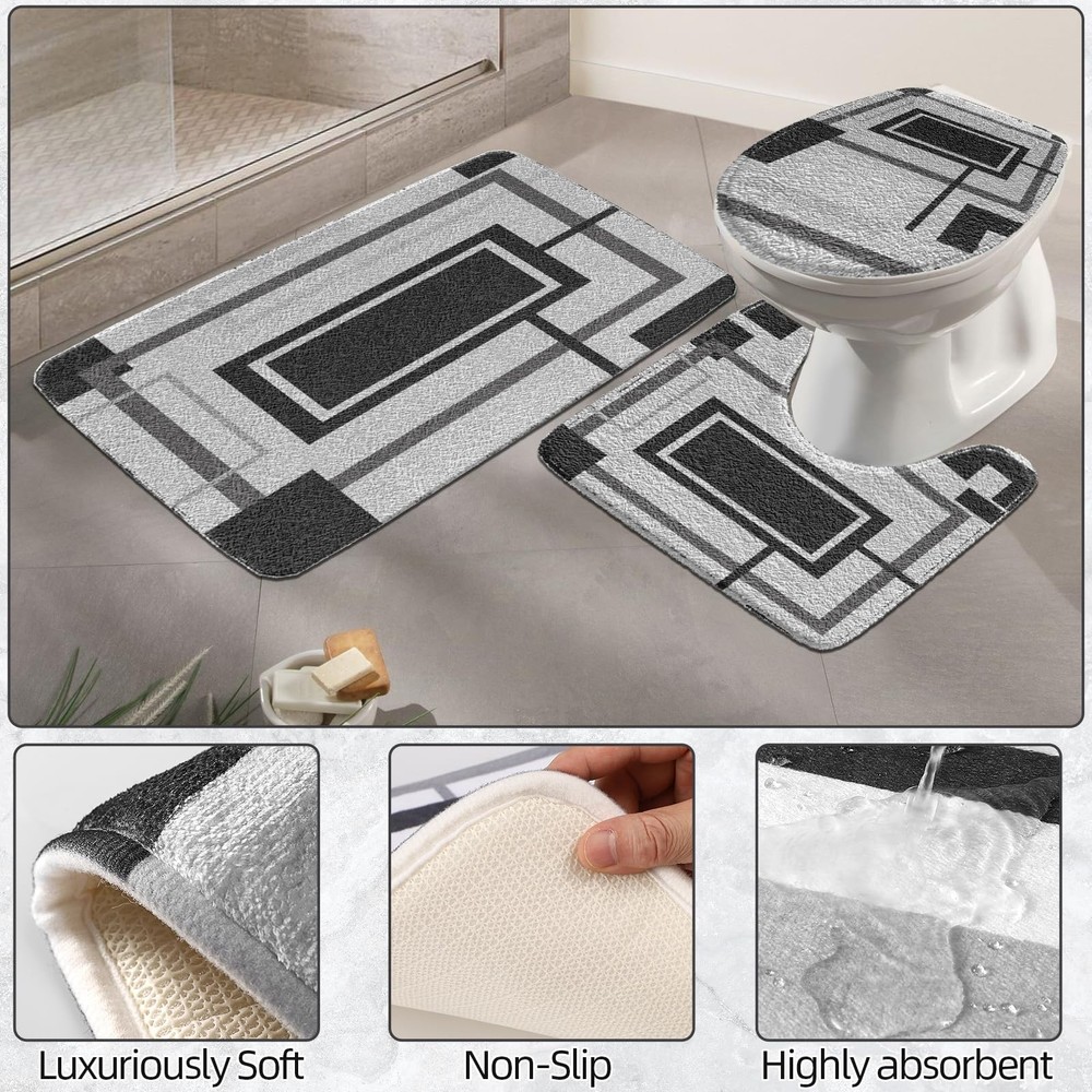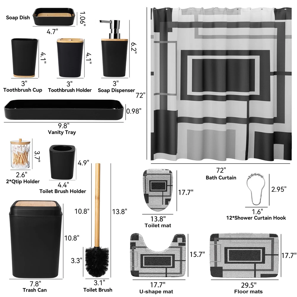 1.Full Functionality bathroom sets: Complete bathroom sets with shower curtain and rugs inclould: 70.9"L*70.9"W Shower curtains, 3PCS Bath Rugs set, trash can , toothbrush cup, toothbrush holder, lotion dispenser,toilet brush, soap holder, vanity tray, two Q-tip holder with lids,and all in one Bathroom Sets, to meet the various needs of your bathroom decoration and daily use. 2. Non-Slip & Ultra-Absorbent Bathroom Rugs:3PCS Flannel Bathroom mat set , memory foam and PVC backing, the flannel surface provides a soft and cozy touch while the PVC memory foam layer ensures good support and stability. adopt advanced HD pattern printing technology, No fading. Dry and comfortable for both bare feet and shoes! 3. Shower Curtain with Rugs :WATER-PROOF Shower curtain for bathroom sets with rugs is made of polyester, weights3.17OZ, size 70.9*70.9 inches; safeguarding your bathroom floor from splashes and spills for a cleaner and drier bathing experience.Printed Bath mat set of 3 (upgraded model) rectangle mat size 17.7*29.5 inches; U-shape mat size 17.7*15.7 inches; toilet mat size 17.7*13.8 inches.Creative and unique patterns instantly refresh and warm your bathroom. 4. Excellent & Refresh Bathroom Decor : This bathroom accessories set is made for you who seeks quality and style. Each product is made of STURDY & LONG-LASTING plastic used in the process of not worrying about falling will break, exquisite design and practicality perfect combination to meet the various needs of your daily life. bathroom set complete not only practical, but also beautiful, shower curtain and rug set make your bathroom space more neat and comfortable. 5.How To Care:Hand wash or machine wash in cold water, hang to dry, iron at low temperature, do not bleach. Please soak them (recommended) before using the mats, so that wrinkles can be removed well. Feel free to us with any questions.