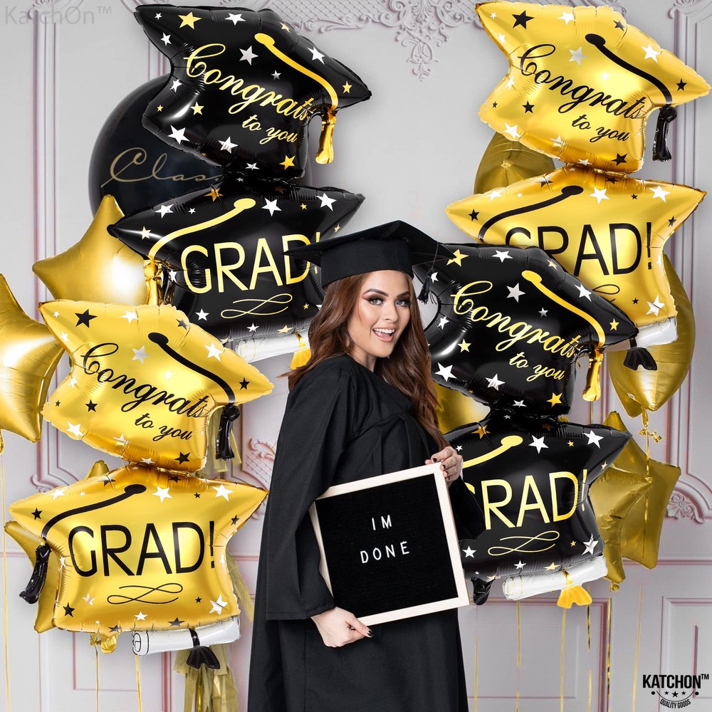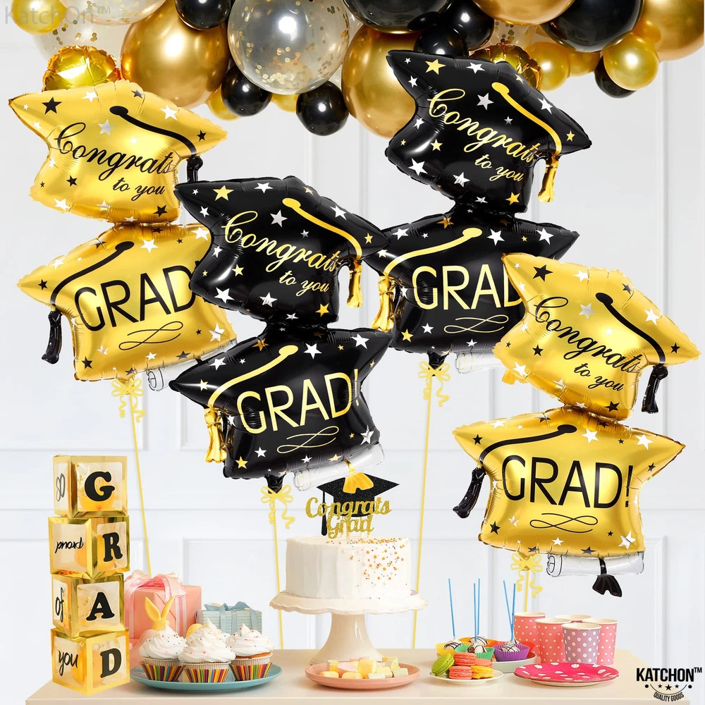 BIG SIZE - 32 INCH | BLACK AND GOLD FOIL BALLOON : Show off your excitement and be proud with the achievements with this giant and beautiful Graduation Hat Balloons that will leave everyone awestruck and add fun element to your congrats grad hat balloon party. Perfect for the graduation 2025 decorations or retirement/work promotion. Show off your excitement and be proud with Graduation cap decorations. Unique graduation cap foil balloons for graduation party decorations 2025. PACK OF 4 | HELIUM SUPPORTED | LITTLE DIY REQUIRED : These Black and gold graduation balloons party favors are helium supported and are size of 32x20 Inch with pack of 4. Simply hang these Graduation grad balloons on the wall, ceiling or at the entrance door to start the excitement. Perfect 2025 graduation balloons class of 2025 for your black and gold graduation decorations class of 2025 or globos de graduacion 2025, Gold Graduation cap balloon. REUSABLE | STURDY | VERSATILE : This 2025 graduation large multicolor graduation cap balloons decor are made sturdy enough to stand long-hour display. This Grad Balloons kit can stay inflated for days or even weeks. Grad cap balloon deflate carefully and proper. These congrats grad foil balloon can be stored to use for next year gold graduation foil balloons decorations. Graduation mylar balloons 2025 graduation party decorations perfect for all ages. ELEVATE YOUR EXPERIENCE : Customer satisfaction is our utmost priority so we made sure to use the grade "A" quality foil material in this 2025 balloons graduation decorations, if for some reason you don't find the congrats balloons satisfactory we are here to help you. Don’t miss this one of a kind graduation cap metallic balloon and start getting more complements for your graduation cap foil balloon 2025 decorations. PICTURE-PERFECT FOR SOCIAL POSTS : Looking for a unique and beautifully crafted mylar graduation balloons 2025? Level up your creative decorating ideas with our innovative style of congrats grad balloons. Give your guests a good vibes upon seeing these huge foil balloons graduation decor class of 2025 balloons. Grab your grad cap mylar balloons for graduation foil balloons 2025 decorations now. Powered by BRND.ME