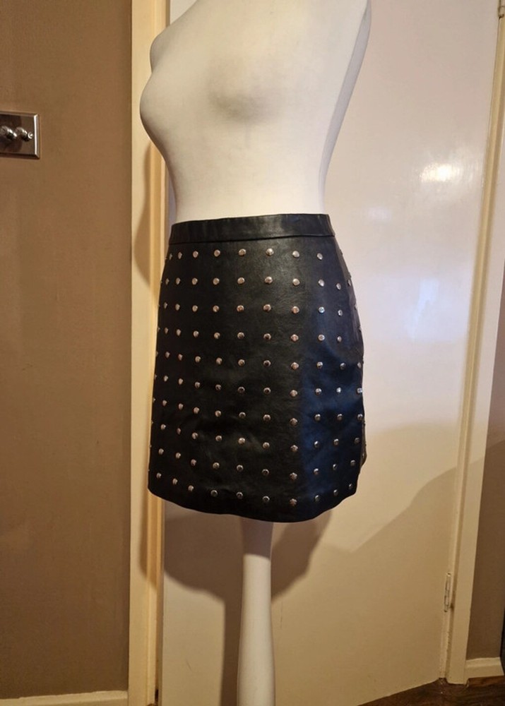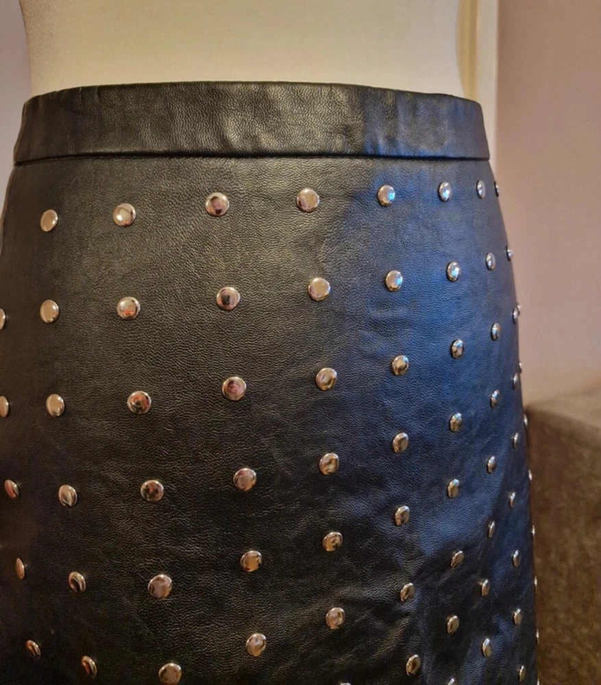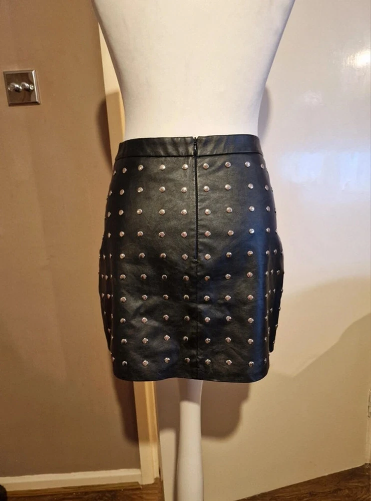 Dancing Leopard faux leather skirt - size 10. Gorgeous silver studding all over. Back zip fastening. Cute floral pattern fully lined fabric. Small scuff under the zip at the back, think it's where I may have caught the zip to the fabric once. Not noticeable when wearing.