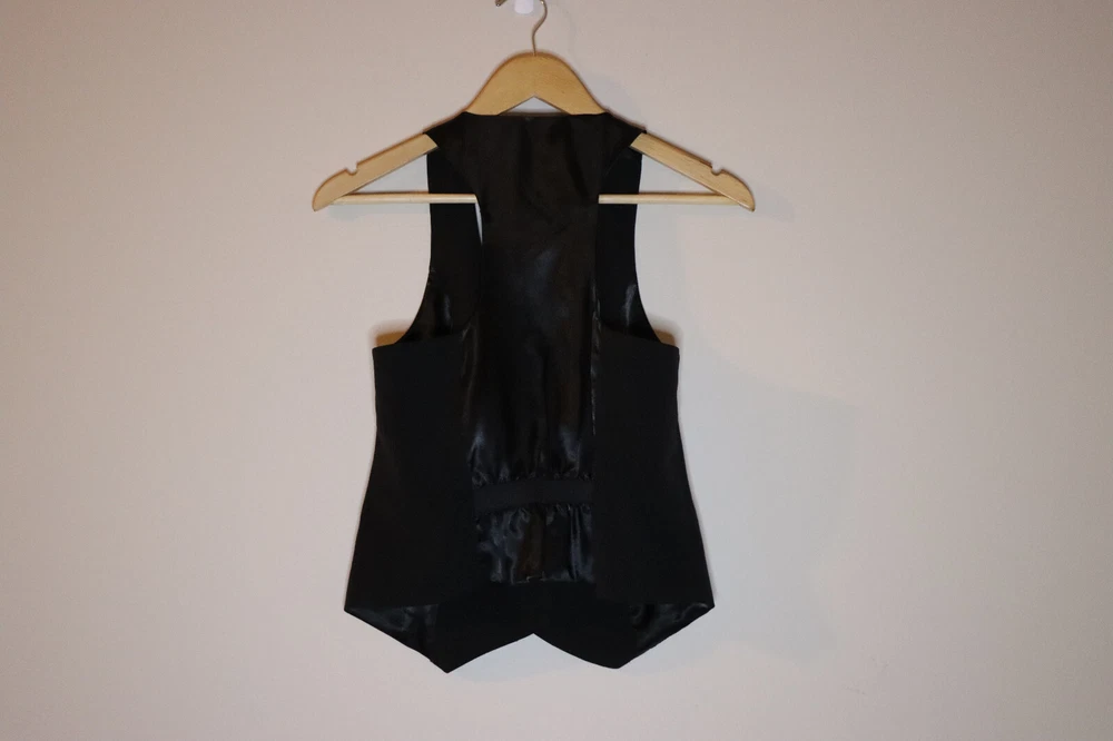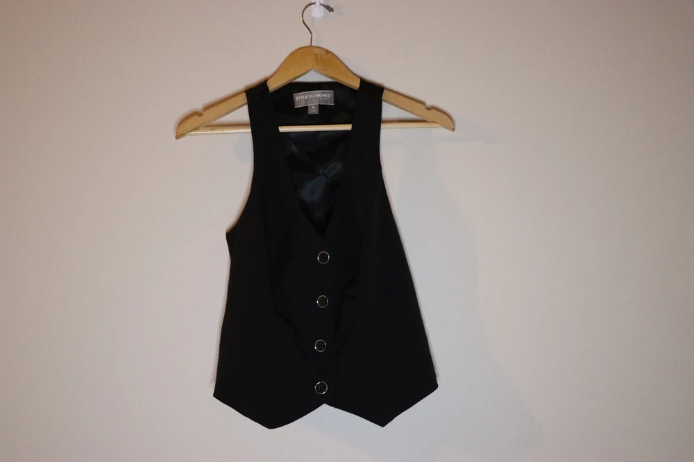 Black sleeveless vest with elastic on the back to cinch waist with four front buttons Brand: Style that Works by Vanity Size: Medium, M Condition: Used, good condition. A sleek black sleeveless vest from the "Style that Works" collection by Vanity. This versatile piece features a tailored fit with an elastic back for added comfort and shape. Perfect for layering over casual or professional outfits, it combines style and practicality. A52 black vest, sleeveless vest, tailored vest, elastic back vest, Vanity Style that Works, women's vest, layering piece, casual wear, professional wear, versatile clothing, chic vest, comfortable vest, elastic detail, fitted vest, wardrobe essential, minimalist fashion, classic black vest, stylish vest, modern design, sleeveless top layer, Vanity vest, black clothing, tailored women's vest, everyday fashion, layering essentials, functional fashion, business casual vest, elastic back design, timeless vest, formal wear, sleeveless black top, fashion staple, sleek black vest, smart layering, sleeveless formal, fashion-forward vest, understated elegance, polished look, black tailored piece, fashionable vest design, black sleeveless top