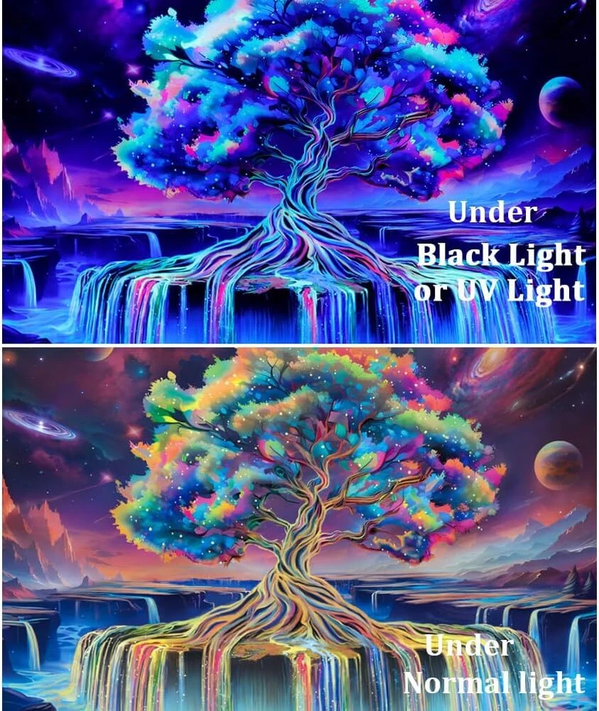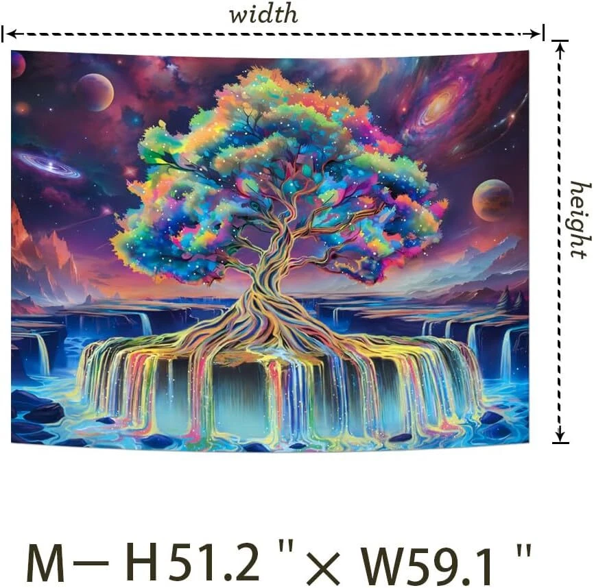 < ul >< li > Material : This blacklight tapestry is made of premium polyester , which is comfy , durable , skin - friendly , soft , lightweight , washable and easy to hang . The aesthetic tapestry has vibrant color and that is a wall art for home decor . < li > Size : There are 2 Sizes for you to choose , W59 "× H51 "( 150 × 130cm ), W78 "× H59 ( 200 × 150cm )". This blacklight UV tapestry is so gorgeous , make sure you get one . < li > Blacklight / UV Reactive : Due to the special ink and advanced technology , the blacklight tree of life tapestry ' s colors can be changed under Black Light or UV Reactive Light . You can enjoy different effects by kinds of light , the tapestry will be amazing . Under normal light , the colors are also beautiful . < li > Decoration : This black light waterfall tapestry adopts HD print that has vivid color and crisp lines . It is perfect for bedroom , teen room , wall hanging , ceiling decor , window curtain , beach blanket , sofa covers , dorm room decor , living room , yoga room and so on . Also , it ’ s a good gift for your friends . < li > Wash Care : It is easy to hang and wash . The galaxy space tapestry can be machine washed in cold water with mild detergent . It can be ironed at low temperature before hanging to remove creases and dry . Do not bleach or dry . < br >< div > < div > < h2 > Product Description < div > < div > < div > < h3 > Blacklight Fantasy Tree of Life Tapestry for Bedroom , Wall Art for Home Decor . < p > < span > About Obsecolors : < ul >< li >< span > Obsecolors is an original store that sells products including tapestries and shower curtains . We always prioritize product quality . There are sorts of tapestries , galaxy theme , boho style , fantasy nature forest theme , you have many choices . Hope you can have a pleasant shopping experience ! < p > < span > Advantages of Blacklight Tree of Life Tapestry : < ul >< li >< span > Best blacklight tapestry you have ever seen . Under Black Light / UV / Led light , you can see fantasy tree of life and neon waterfall that is so wonderful . < li >< span > The blacklight tree of life tapestry not only can decorate the room wall also make your room more artistic . The tapestry adopts high - definition printing technology , so you can see all the details . < li >< span > The trippy tapestry can be used in all seasons , and hope this colorful tree of life tapestry can make you feel happiness and make your life more interesting .