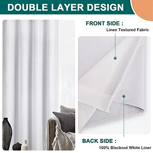 Return Policy Fast Delivery Trusted seller 100% Blackout Curtains White Linen Curtains for Bedroom Grommet Thermal Insulated Room Darkening Drapes (2 Panels, W52 x L84 Inch) Product Description 100% BLACKOUT: Offer you a real dark environment, improve sleep quality. Bedroom darkening curtains added blackout lining on back to completely block out 100% sunlight, turn day into night. Help you free from sunlight or night street lights to enjoy sweet sleeping, full of energy every day. ELEGANT LINEN LOOK: Bring more classic and graceful look to your room with solid burlap curtains panel, refresh your space. Delicate no shiny texture white linen blackout curtains have a good sense of drape, matched with many different decors, perfect choice for bedroom, living room, kids room, nursery, sliding glass doors, office. EASY TO INSTALL: Package includes 2 curtain panels, each classic lined curtain measures 52" wide x 84" length (Total 104" width). Top 16 non-rust grommets design makes linen curtains easy to install, silver ring (1.6 inch inner diameter) fit with most of standard curtain rods and easily glides on the rod to open and close. LASTING SERVICE LIFE: Crafted from thickening faux linen textured fabric, backed with soft-touch full blackout white liner, and every detail with clean stitching. Durable and weighted fabric retains the curtain's shape well when it hung and easy to care, machine washes cold, gentle cycle, tumble dry low, iron low, steam clean, do not bleach. INSULATED: Balance room temperature and reduce noise. 2 layers heavy and thick window draperies help you adjust room temperature by insulating against summer heat and winter chill, save energy costs. Thick curtains also effectively reduce outside noise, create a peaceful and relaxing environment. Shipping Returns Payment Shipping Shipping is FREE to all addresses other than APO/PO boxes in the lower 48 states. All our stock ships from US-based warehouses. Shipped via USPS or UPS (depending on location and package weight) Unless stated otherwise, all orders will ship within 24-72 hours of your payment being processed. Check our feedback to see the great reviews of FAST shipping we offer. Returns Seller does not accept returns Payment We currently accept payment via eBay managed payments only. Once payment is cleared, we will dispatch your shipment within 1-3 business days. Please refer to the "Shipping" tab for more information regarding shipping speed to your destination.