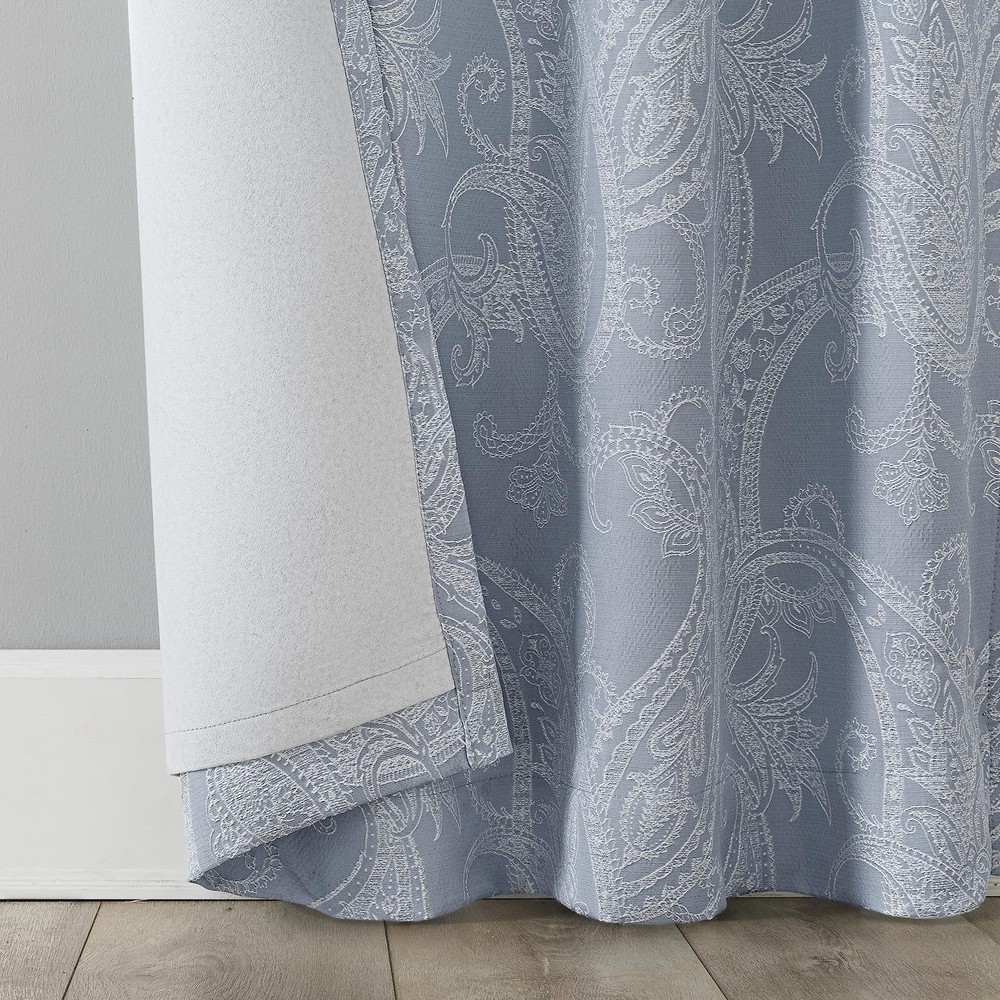 Featuring an intricately embroidered paisley pattern, Pedra Paisley Embroidery 100% Blackout Back Tab Curtain Panels add delicate detail to any living space. Equipped with back tabs for easy hanging on standard curtain rods up to 1.5" in diameter. Extreme Blackout™ Thermal Lining is laboratory tested to block out 100% of light, reduce outside noise by up to 40%, and decrease energy lost through your windows by up to 40%. Comfort is optimized with thermal properties that help keep summer heat and winter chill out of your home. Built-in metal grommets allow for easy slide-through installation on curtain rods up to 1.5" in diameter. Hang in your entertainment room to eliminate screen glare and reduce distracting outside noise, or in your bedroom for enhanced privacy and a sounder, more uninterrupted sleep. Sold as individual panels measuring 40" width by 84" length in color tranquil blue. Measure carefully before selecting your desired size and quantity. Rod not included. Machine wash cold on gentle cycle. Use non-chlorine bleach when needed. Tumble dry on low heat, using a cool iron as needed. Intricately embroidered paisley pattern adds delicate detail Extreme Thermal Blackout technology blocks out 100% of outside light Thermal properties help keep summer heat and winter chill out of your home Noise reduction up to 40% helps you get a sounder, more uninterrupted sleep back tabs fit curtain rods up to 1.5" in diameter Panels sold individually. Measure carefully prior to purchase (Image features 2 panels)