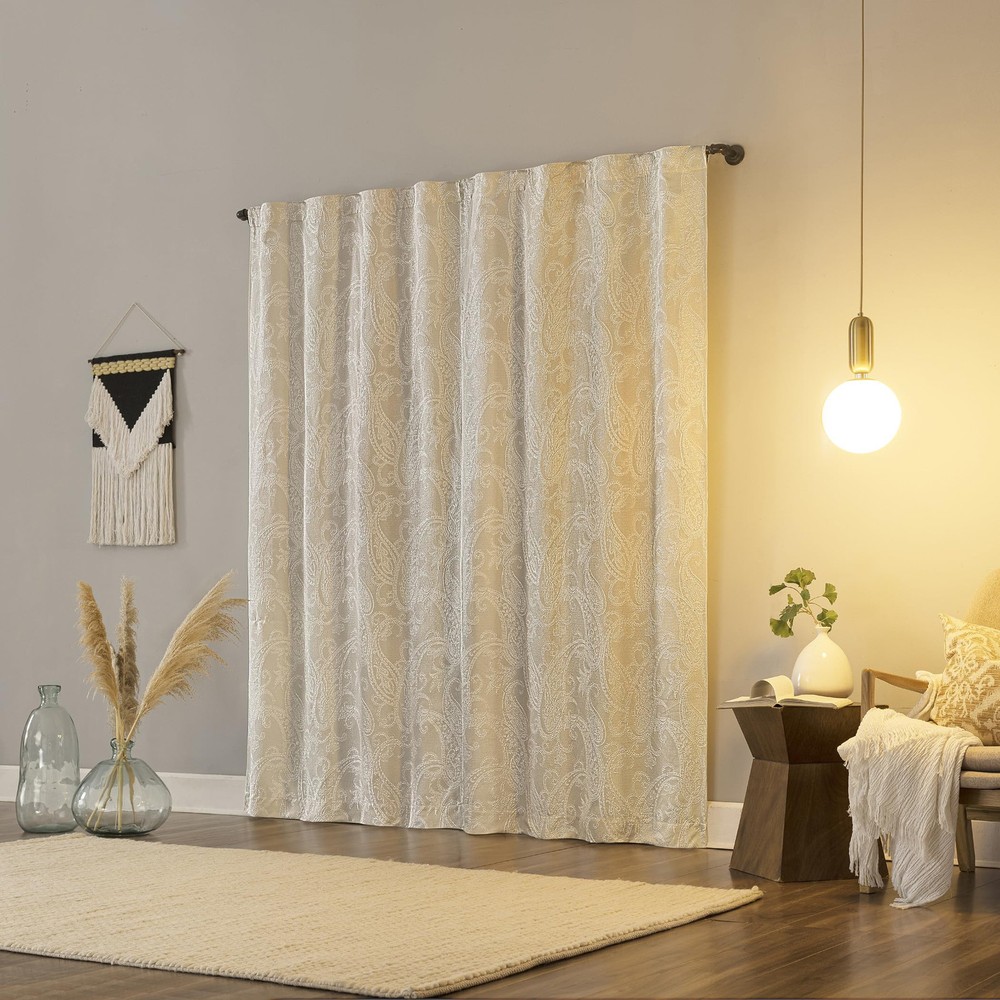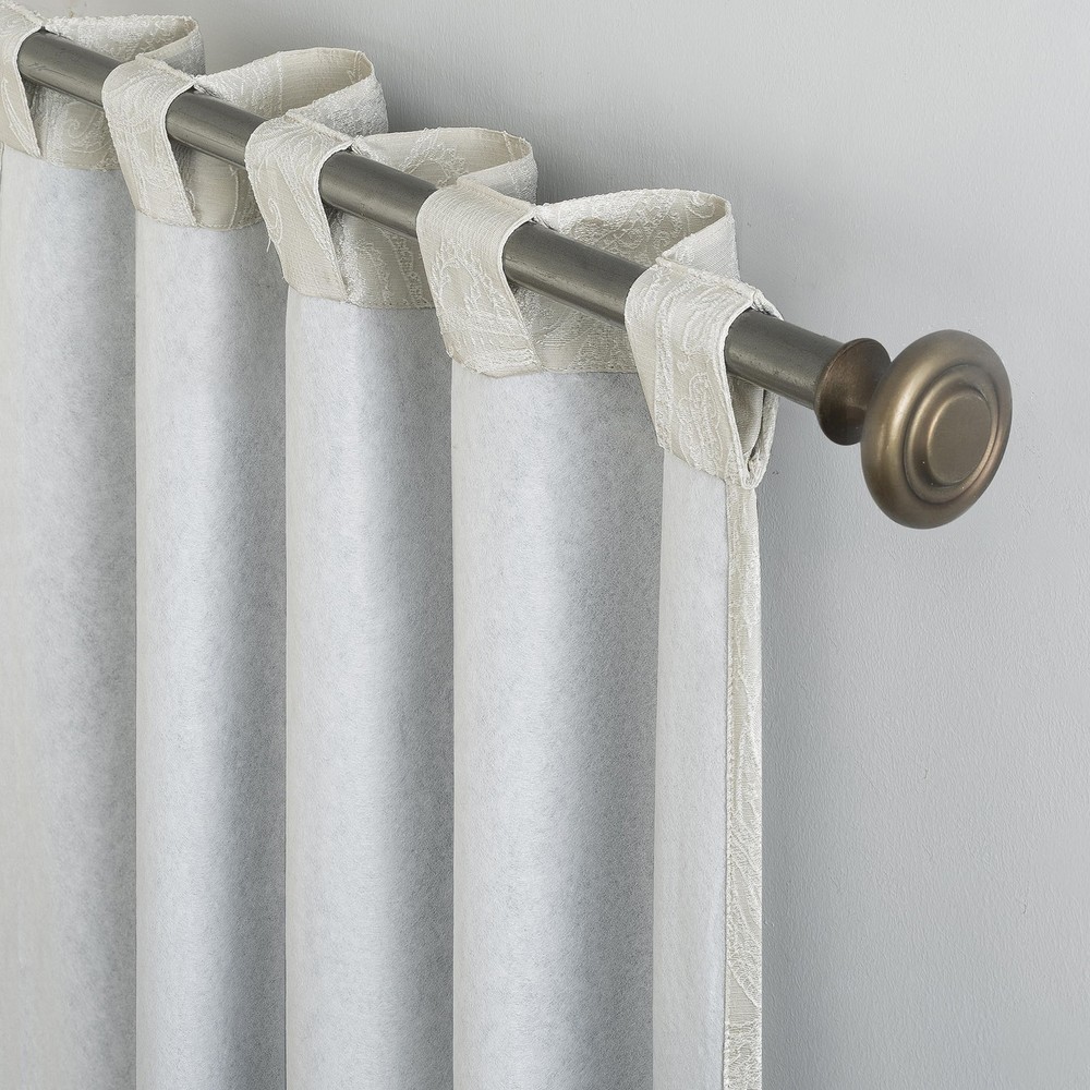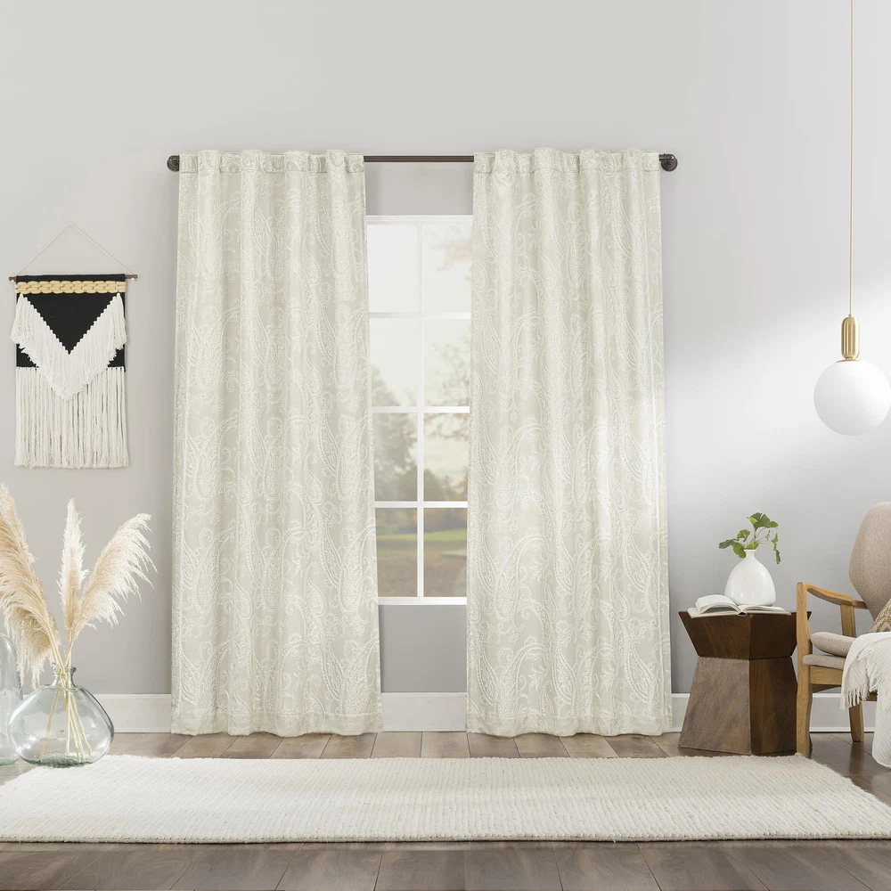 Featuring an intricately embroidered paisley pattern, Pedra Paisley Embroidery 100% Blackout Back Tab Curtain Panels add delicate detail to any living space. Equipped with back tabs for easy hanging on standard curtain rods up to 1.5" in diameter. Extreme Blackout™ Thermal Lining is laboratory tested to block out 100% of light, reduce outside noise by up to 40%, and decrease energy lost through your windows by up to 40%. Comfort is optimized with thermal properties that help keep summer heat and winter chill out of your home. Built-in metal grommets allow for easy slide-through installation on curtain rods up to 1.5" in diameter. Hang in your entertainment room to eliminate screen glare and reduce distracting outside noise, or in your bedroom for enhanced privacy and a sounder, more uninterrupted sleep. Sold as individual panels measuring 40" width by 96" length in color pearl white. Measure carefully before selecting your desired size and quantity. Rod not included. Machine wash cold on gentle cycle. Use non-chlorine bleach when needed. Tumble dry on low heat, using a cool iron as needed. Intricately embroidered paisley pattern adds delicate detail Extreme Thermal Blackout technology blocks out 100% of outside light Thermal properties help keep summer heat and winter chill out of your home Noise reduction up to 40% helps you get a sounder, more uninterrupted sleep back tabs fit curtain rods up to 1.5" in diameter Panels sold individually. Measure carefully prior to purchase (Image features 2 panels)