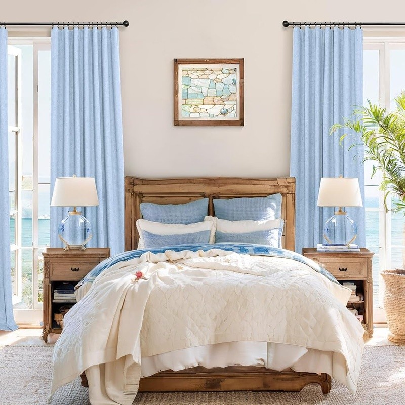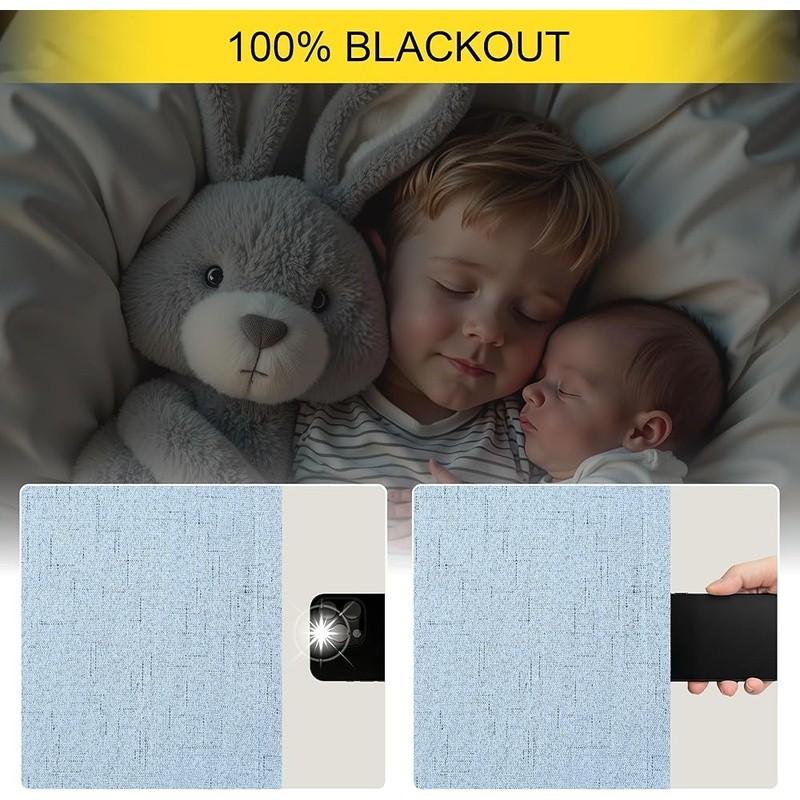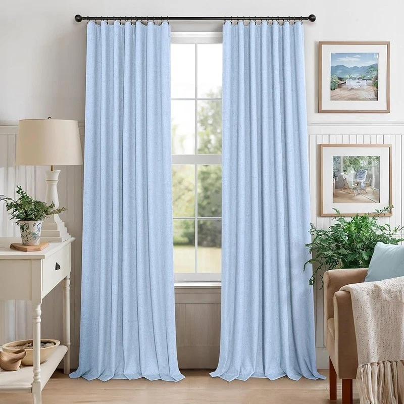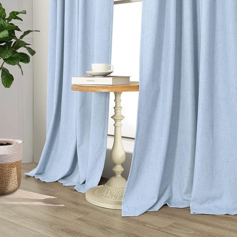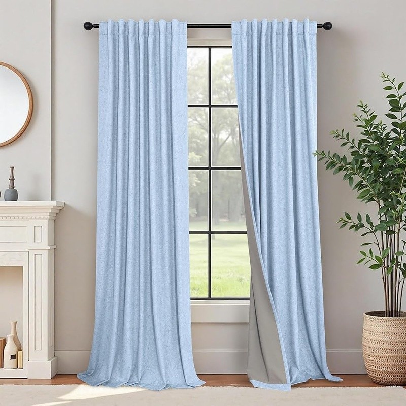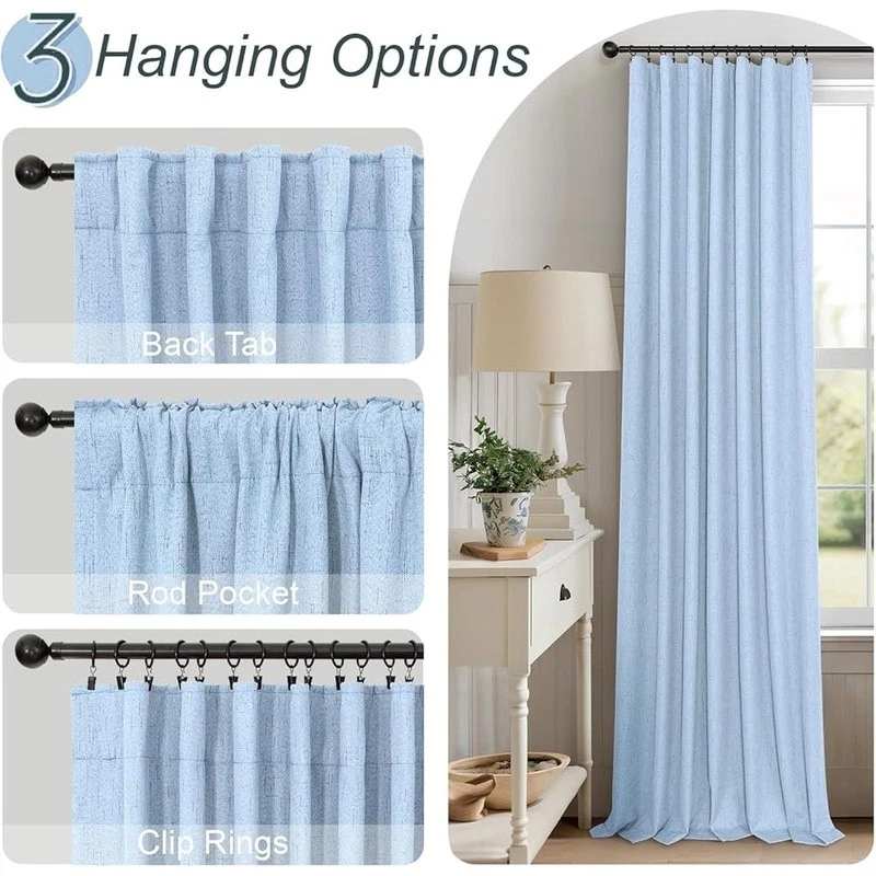 About this item Pair Sold: 2 panels per package. Each panel measures 52 inches wide by 108 inches Long, pair measures 104 inch width x 108 inch Length. 3 in 1 hanging style includes (1) using the back loops to create an elegant pleated effect, (2) from the 3 inch rod pocket for a classic look, or (3) using clip rings for easy, slide open and closed (clip rings not included) 100% Blackout Curtains: A total blackout thermal coating layer is attached to the back of our faux linen curtains, blocking 100% of sun light and UV rays. Providing a completely dark environment for sleep and privacy. Good choice for bedroom, nursery room, kids room, living room, dining room, office, sliding glass door Beautiful Linen Style Texture: black out curtains are crafted from thick, textured linen look fabric. The 250gsm fabric allows the panels to drape well while remaining lightweight and soft, similar to linen and cotton. Affordable dupes of expensive real linen cotton drapes. Burlap and neutral tones create a more classic look. Perfect for boho, modern farmhouse, shabby chic, country, rustic, vintage decorations Energy Smart: thermal insulated blackout shades are not only light blocking and room darkening but also provide thermal insulating, noise reducing, and heat blocking in summer while reducing indoor heat loss in winter to maintain a balanced temperature, achieving energy savings Easy Care: Cool iron on the FRONT SIDE if needed. DO NOT iron the coating on the back side. Machine washable in cold water, do not bleach, tumble dry low. To better protect the coating, avoid using the dryer. Find more linen curtains in Store Brand: Color: Light Blue Material: Polyester Product Dimensions: 108"L x 52"W Opacity: Blackout Inches