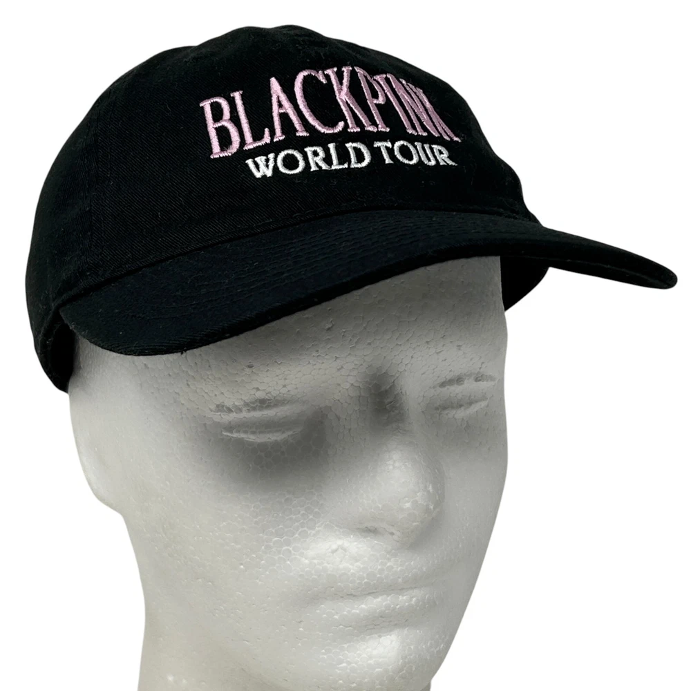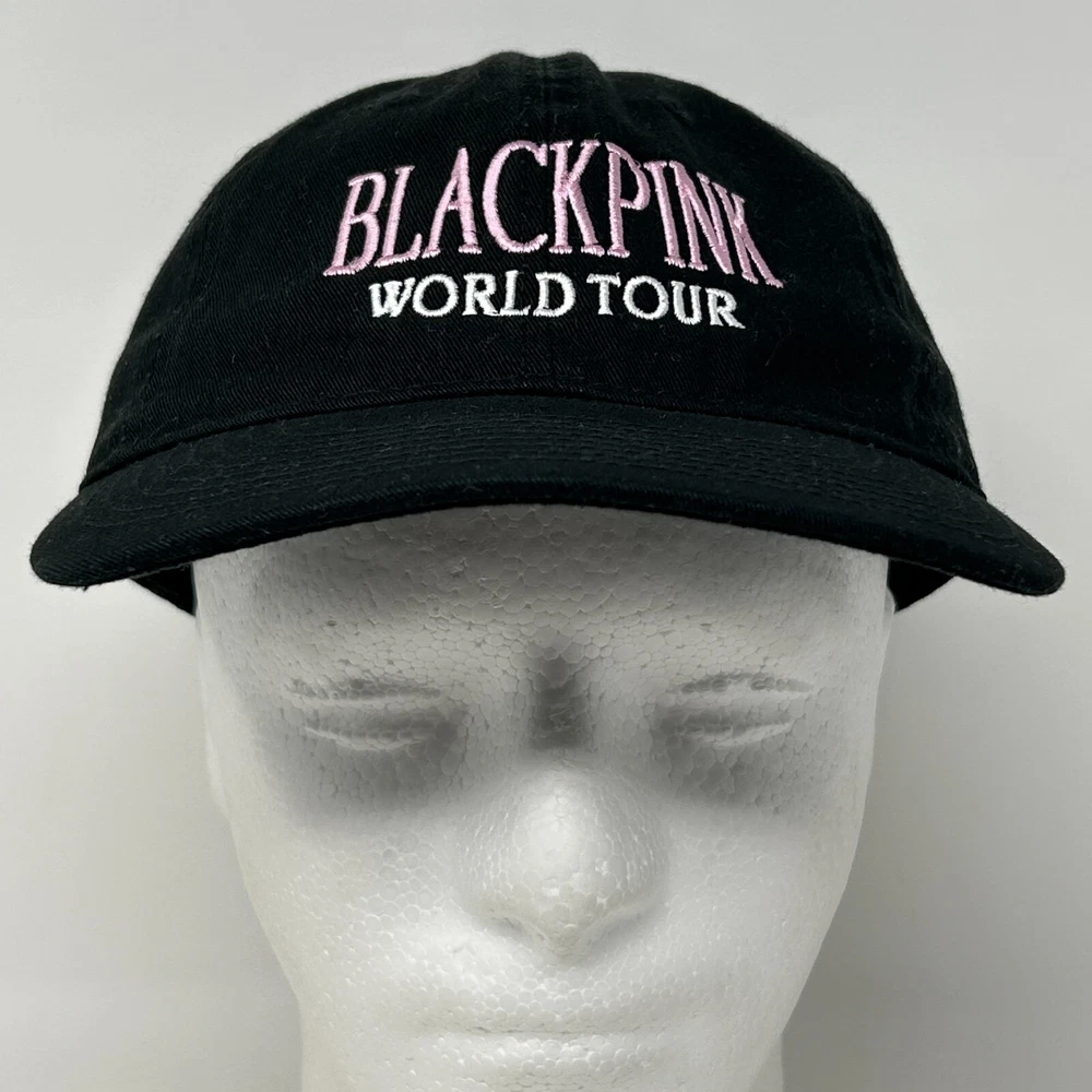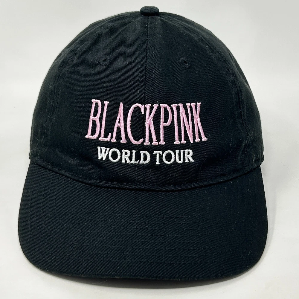 Blackpink World Tour Dad Hat Baseball Cap South Korean K-Pop Girl Group Band Strapback Black Six Panel Will be shipped in a box. CONDITION: In very good used condition. No flaws noticed. Has been cleaned and sanitized. See photos.