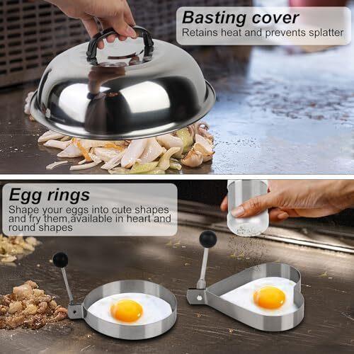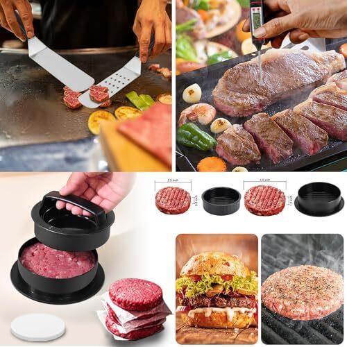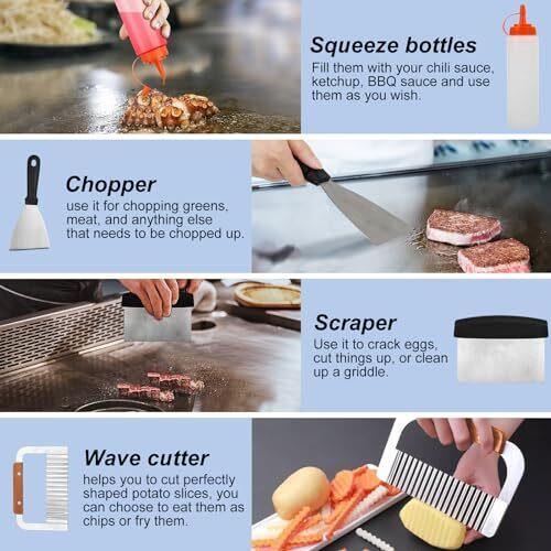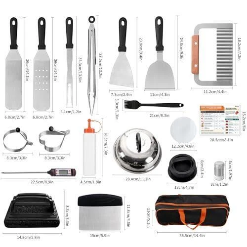 - 25 Pc Set Material Stainless Steel Item dimensions L x W x H 14.6 x 11.9 x 3.7 inches Item Weight 5.1 Pounds Handle Material Plastic 【Complete Selection of Grill Tools】This Griddle Accessories Kit includes everything you need for outdoor grill: 1* long griddle spatula, 1* slotted spatula, 1*scraper, 1* slant edge scraper, 2* squeeze bottles, 1* chopper, 4* egg rings, 1* tong, 1* cleaning brush, 2* spice shakers, 1* sauce brush, 1* basting cover, 1* thermometer, 1* baking fork, 1*wave cutter, 1* magnetic instructions, 1* meatloaf mold, 1* silicone paper, 1* storage bag, 1* gift box. 【Premium Food Grade Stainless Steel】Crafted from high-quality food grade stainless steel, our griddle accessories for blackstone are durable, rust-resistant. It has excellent corrosion resistance and durability, does not rust, discolor, or release harmful substances, It can withstand high temperatures, high pressures, and frequent use without worrying about deformation or damage. 【Easy to Clean, Store & Carry】The sleek design of these flat grill accessories makes cleaning a breeze, surface of the food-grade stainless steel is very easy to clean, it does not absorb food residues, which helps prevent bacterial growth. Pair with a storage bag for easy organization and carrying during outdoor BBQ. 【Ideal Outdoor BBQ Gift Choice】Whether for a seasoned grill master or a novice cook, whether it's Father's Day, Thanksgiving, or Christmas, birthdays, anniversaries, etc, this blackstone accessories kit makes the perfect gift for anyone who enjoys cooking outdoors and creating delicious meals.