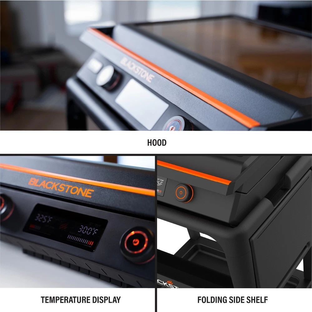 Product details Bring what you love about cooking on a Blackstone indoors with this Blackstone E-Series 22” Electric Tabletop Griddle with Prep Cart. Whether you want to place this griddle right on your tabletop or use the cart to wheel it out onto your patio, this electric griddle and cart combination means you can cook on your Blackstone indoors or outdoors. This griddle includes a digital temperature display and a removable transparent glass hood that allows you to easily keep an eye on your food. The non-stick griddle surface and Blackstone-patented Rear Grease Management system make grease management and cleanup so much easier. With 312 square inches of cooking space and two variable temperature zones, you can create delicious and savory meals for breakfast, lunch, and dinner whether indoors or out. Blackstone E-Series 2-Burner 22" Electric Tabletop Griddle with Prep Cart 312 sq in cooktop surface with 2 independently controlled burners Non-stick ceramic titanium-coated griddle surface for easy cooking and cleanup Large LCD digital display for easy readability The patented rotate and remove glass hood provides sleek protection and traps heat for cooking and steaming The Blackstone-patented Rear Grease Management System and a dishwasher-safe grease cup make cleanup quick and easy Counter-height cart with a folding side shelf makes it possible to use the griddle indoors or outdoors 1600W/120V/10A electrical requirements Assembled dimensions (including cart): 37.62" L x 20" W x 40.16" H 1-Year Limited Warranty Customer Service: +1 (435) 252-3030 Ext. 1 Model # 8003