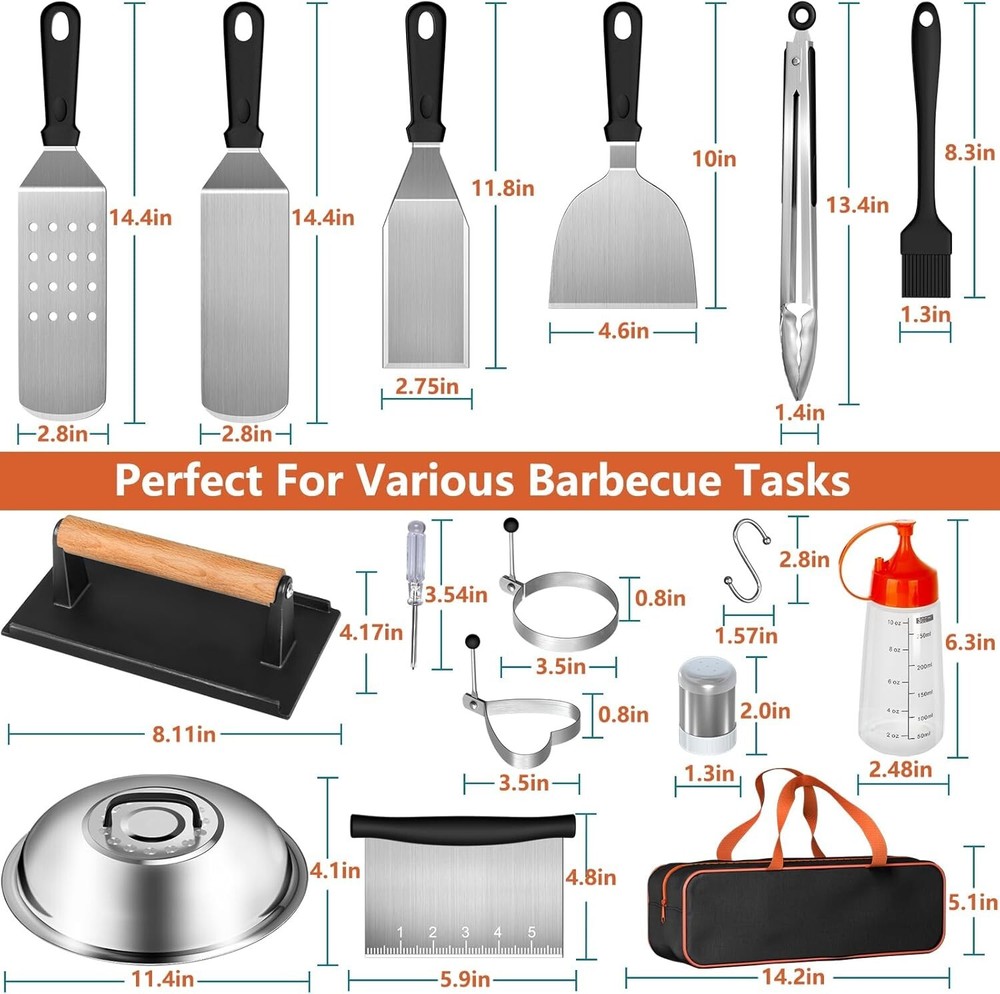 Blackstone Griddle Accessories Kit, 24Pcs Flat Top Grill Accessories Kit for Cam Product Details: Elevate your outdoor cooking experience with the Blackstone Griddle Accessories Kit. This 24-piece flat top grill accessory kit is specifically designed for the avid camper, griddle enthusiast, or backyard grill master. Whether you're cooking at home, tailgating, or camping, this complete set will ensure you have everything you need to cook like a pro! Key Features: Complete 24-Piece Set: This kit includes all the essential tools to maximize your griddle cooking experience, providing you with the tools necessary for flipping, scraping, stirring, seasoning, and maintaining your griddle for years of reliable performance. Durable, High-Quality Construction: All tools in this kit are crafted from premium stainless steel or BPA-free materials to ensure long-lasting durability and resistance to rust and corrosion. Each item is built to handle high heat and the rigors of outdoor cooking. Perfect for Blackstone Griddles: Tailored to work seamlessly with Blackstone Griddles, this set is compatible with 17", 22", 28", and 36" models, ensuring you can easily upgrade your cooking tools regardless of your specific grill size. Comprehensive Set for Every Need: Griddle Tools: Includes spatulas, a slotted turner, and a griddle scraper to help you effortlessly flip burgers, steaks, vegetables, and more. Cooking Utensils: Includes tongs, a basting brush, and ladles for easy preparation and serving. Griddle Maintenance Tools: Includes a grill cleaning brush, grease cup holder, and scraper to keep your griddle clean and functioning at its best. Cooking Accessories: Includes a butter melting dome, egg rings, and a thermometer to ensure perfectly cooked meals every time. Convenient Storage Case: All 24 pieces come neatly organized in a compact, durable carrying case for easy transport and storage. Perfect for grilling on the go, whether you’re camping, tailgating, or grilling in your backyard. Non-Slip Handles & Easy-Grip: Each tool features ergonomic, non-slip handles for a secure grip, ensuring comfort and safety while cooking at high temperatures. What's Included: 2 Spatulas (Wide and Slotted) 1 Griddle Scraper 1 Grill Cleaning Brush 1 Grease Cup Holder 1 Butter Melting Dome 2 Egg Rings 1 Basting Brush 1 Set of Tongs 2 Heat Resistant Gloves 1 Grill Thermometer 3 Condiment Bottles 1 Grill Brush Cleaner 3 Scrubbing Pads 1 Carrying Case for Easy Storage