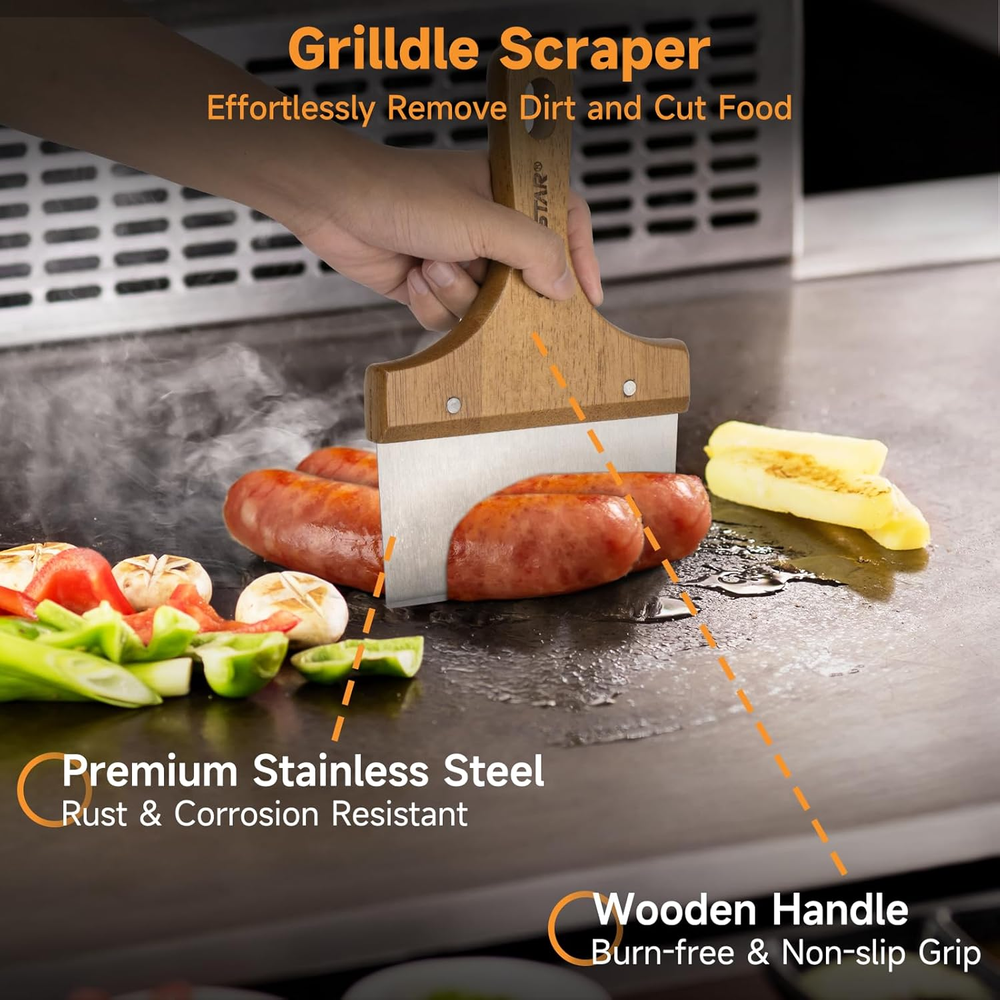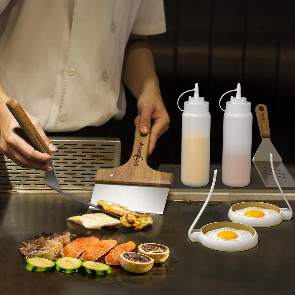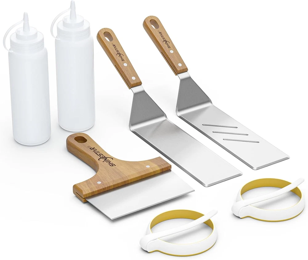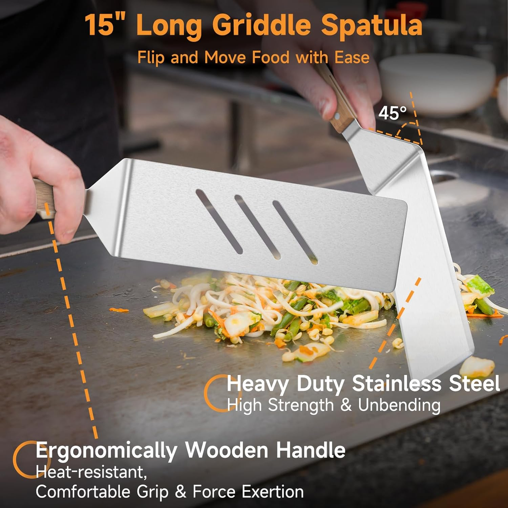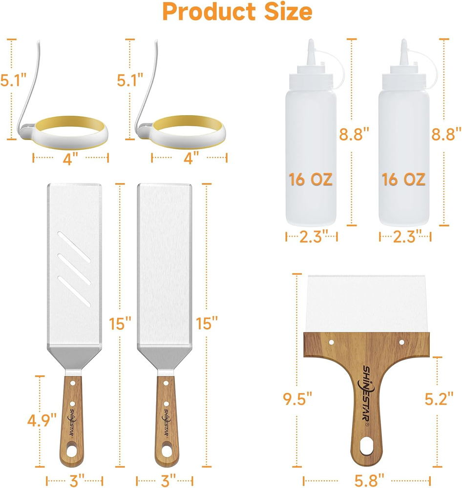 Griddle Spatula Set Scraper Squeeze Bottles Egg Rings Accessories for Blackstone 【Deluxe Spatula Griddle Kit】 Upgrade your cooking experience with the versatile flat top grill accessories, which includes 7 pcs essential tools for delicious meals at home or outdoors, such as long spatulas, chopper, squeeze bottles, and egg rings, making it perfect for making steaks, burgers, veggies, breakfast pancakes, and more. 【Super High Quality】 14 gauge extra thick stainless steel, sturdy and rust-resistant for long-term outdoor use. Hardwood handles with a sanding process offer a heat-resistant and non-slip grip. 【15 In. Long Spatula】 Has the right balance of flex and stiffness to flip and pick up food, such as eggs, fried rice, sauteed vegetables, etc. The slotted one helps drain grease for healthier eating. 【Versatile Chopper】 Break up the cooked debris on your griddle surface and get your griddle spotless in no time at all. Also, perfect for chopping or slicing needs. 【Upgraded Egg Rings】 Made from high-grade silicone, it is non-stick, non-leaking, and heat-resistant for long-term use. Features the upgraded taller fold-able handles and larger egg rings for endless possibilities- frying eggs, sausage patties, hamburgers, hash browns, crumpets, and crab cakes, and more. Product Description 1 Flip & Pick-up Food 2 Chop or Slice Food 3 Fry Eggs or Patties 4 For Ketchup & Sauces 1 15" Flexible Long Spatula 2 Versatile Chopper 3 Upgraded Egg Rings 4 16oz Squeeze Bottles Item model number P31 Item dimensions L x W x H 39 x 17 x 9 inches Product Dimensions 39 x 17 x 9 inches Material Stainless Steel Country of Origin China Is Dishwasher Safe Yes Item Weight 2.53 pounds Handle Material Wood Number of Pieces 7 Included Components Spatula Shipping Fast shipping is very important for us. Our expedited US shipping service is FREE. Your order will be shipped within 2 business days upon full payment received. Your order will be delivered within 2-3 business days after the handling time. Warranty & Returns 30-Day FREE Return Policy offered for unsatisfactory items. Options include: Refund or Exchange for another item. Contact us Customer satisfaction is our top priority. If you encounter any issues with our product, please don't hesitate to reach out to us. We are committed to ensuring your satisfaction and will go above and beyond to assist you. Your happiness is our goal! Thank you for shopping at our store.