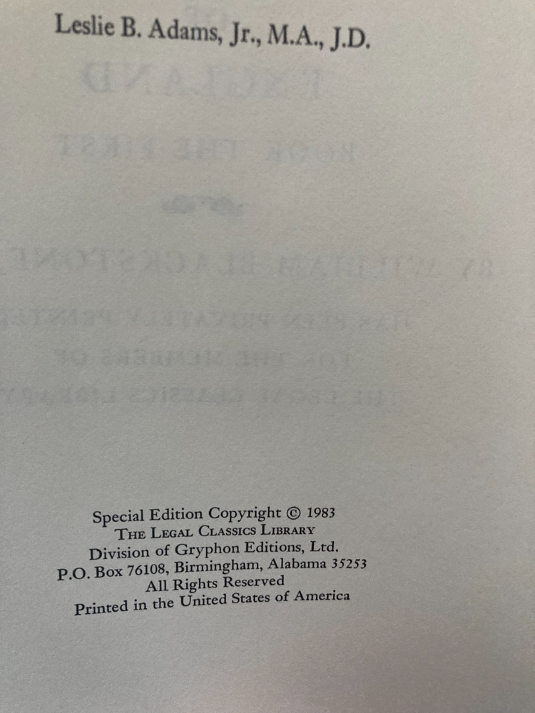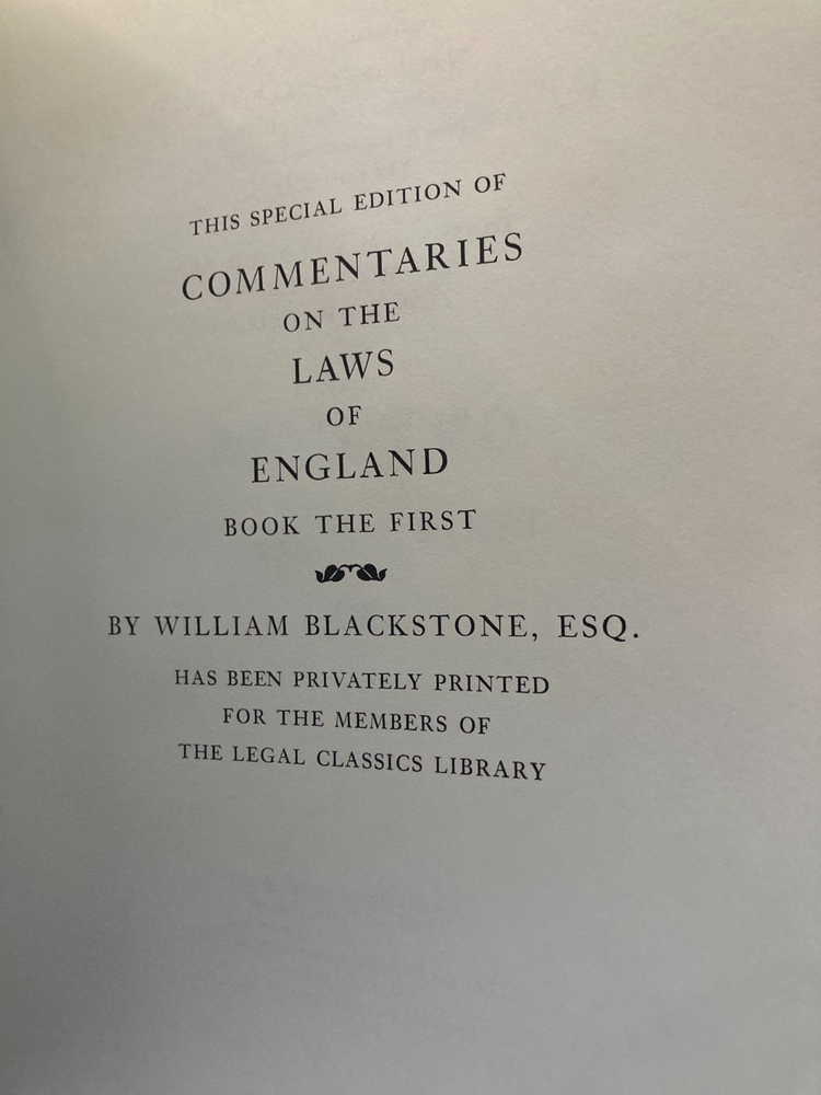 Blackstone's Laws of England - 4 Vol Leatherbound Set Legal Classics Library 1983. VGC. Light wear only.