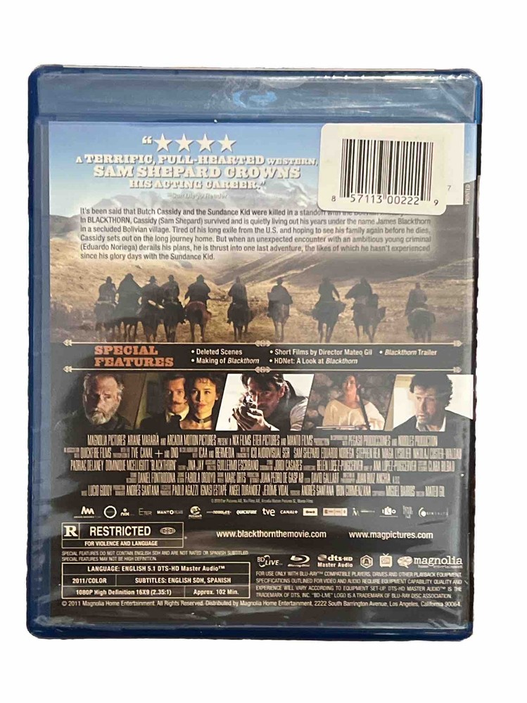 The product is a Blu-ray version of the 2011 Western film "Blackthorn." It is produced by Magnolia Home Ent and includes one disc. The movie follows the story of an aging Butch Cassidy living under a false identity in Bolivia, reflecting on his past adventures. This Blu-ray release allows viewers to enjoy the film in high definition quality with enhanced audio and visual features. "Blackthorn" offers a unique take on the Western genre, providing a fresh perspective on a legendary historical figure. New but partially torn seal