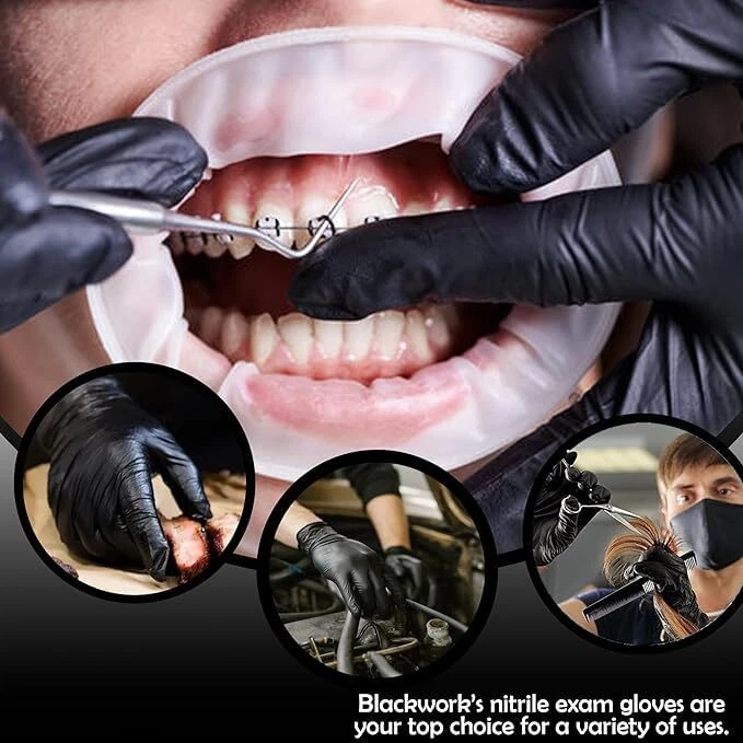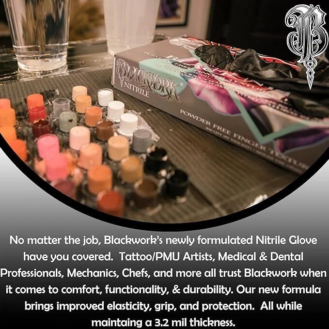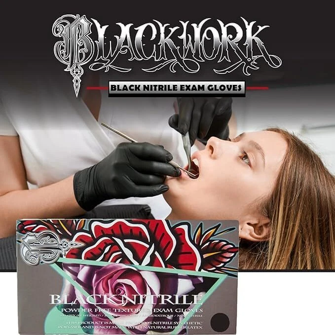 Description " Experience 's Ultra Elastic Black Nitrile Gloves. Our luxurious, black nitrile gloves offer improved protection, comfort, and grip, making them the ideal choice for a multitude of tasks. Whether you're a professional tattoo artist seeking the perfect tattoo gloves, a mechanic in need of durable mechanic gloves, or a food professional looking for food-grade, cooking gloves disposable food safe, our gloves are designed with your needs in mind. Our black nitrile gloves are not just functional, they're also incredibly comfortable. Crafted with our own Ultra Elastic Black Nitrile Formula, these gloves offer Near Zero resistance, reducing hand fatigue over long hours of wear. The textured surface provides greater grip and tactile sensitivity, making them the perfect disposable gloves for precise tasks. Moreover, these gloves are latex-free and powder-free, making them safe for users with latex allergies. At 3.2 mil, these gloves are resistant to tears and punctures, ensuring they can withstand even the most demanding tasks. Experience the perfect blend of protection and functionality with 's Black Nitrile Gloves. " Luxury, Disposable Gloves - Ultimate luxury with 's newly formulated disposable Nitrile Gloves. These gloves are stronger and thinner than before, and provide exceptional comfort and reduce muscle fatigue. Designed with our new nitrile compound that is more elastic and comfortable, ensuring extended wear without compromising on strength. The black color adds a touch of sophistication, making them suitable for all professional settings. 100 Gloves per Box - Each pair of black disposable medical grade nitrile gloves is designed to be easy to put on and take off without compromising your dexterity. Our gloves come with 100 pairs of long lasting nitrile disposable gloves in each box. Blackwork offers quantity discounts available in 3 pack, 5 pack, and 10 pack mastercases. Ideal Tattoo Glove - Blackwork's newly formulated black nitrile disposable gloves were originally created with long tattoo sessions in mind. The ultra thing design, extra elasticity, and increased texture for grip were added to help support the muscles for artists whose hands are in a cramped position for long periods of time. Our gloves are also soft and textured to improve grip. These provide a more comfortable and longer lasting glove. Versatility - These gloves are not only for Tattoo Artists but also ideal for medical professionals, dental hygeniests, nurses, painters, cleaners, plumbers, security personnel, andthe food industry. Their superior strength and comfort make them perfect for extended wear in a variety of fields. This makes them not only a practical choice but also a versatile one. Whether you're a nurse, first responder, or cook, Blackwork's black nitrile exam gloves meet your needs with ease. Latex & Powder Free - Our nitrile exam gloves are completely latex and powder free, providing zero risk of latex or rubber allergens. Ideal for professionals seeking a safe and comfortable glove solution for extended wear during long procedures. This makes them perfect for use as medical gloves, tattoo gloves, cooking gloves, mechanic gloves, and more.