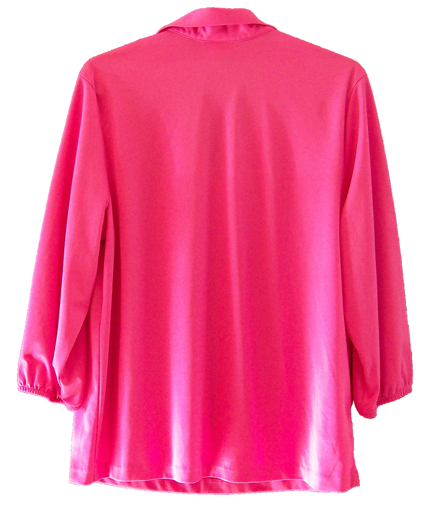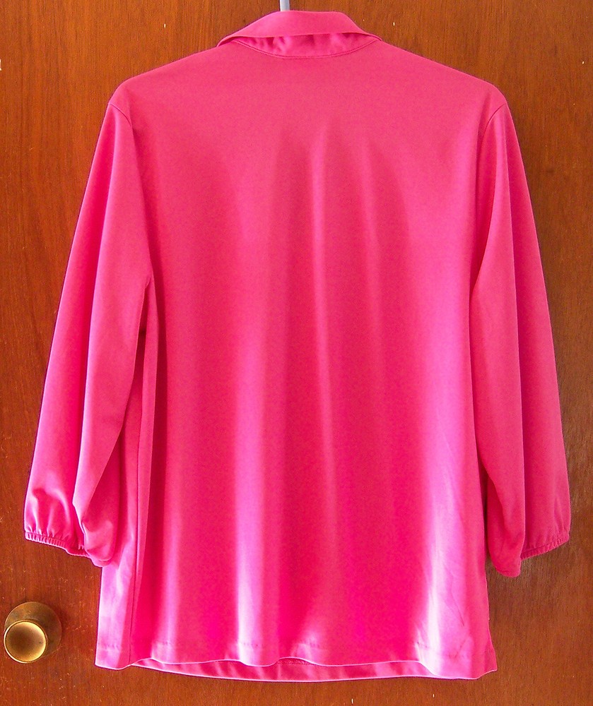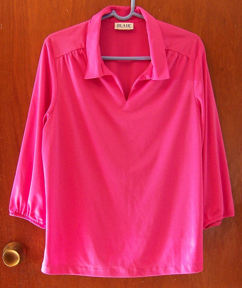 Blair Women's Large V-Neck Polo Top Pullover Magenta Pink Polyester 3/4 Sleeve Blouse. Size regular women's US L Large. Pullover style top. Length from shoulder seam to bottom hem measures approximately 26" inches. Measures approximately 22" inches across under arm seems. Sleeve measures from shoulder seam to bottom elastic banded hem is approximately 18" inches in length. 3/4 length sleeve style with elastic banded hem. V-neckline with collar. Color is a magenta pink. Made of a polyester knit fabric. Preowned very good condition. From a smoke free home. A very good looking top. See photos. (These are my photos of the item and cannot be used for any reason.) I will combine shipping costs when you buy more than one item. Shipping cost is based on your location and weight. If there are any questions please ask before you buy. S ale is final. No refunds.