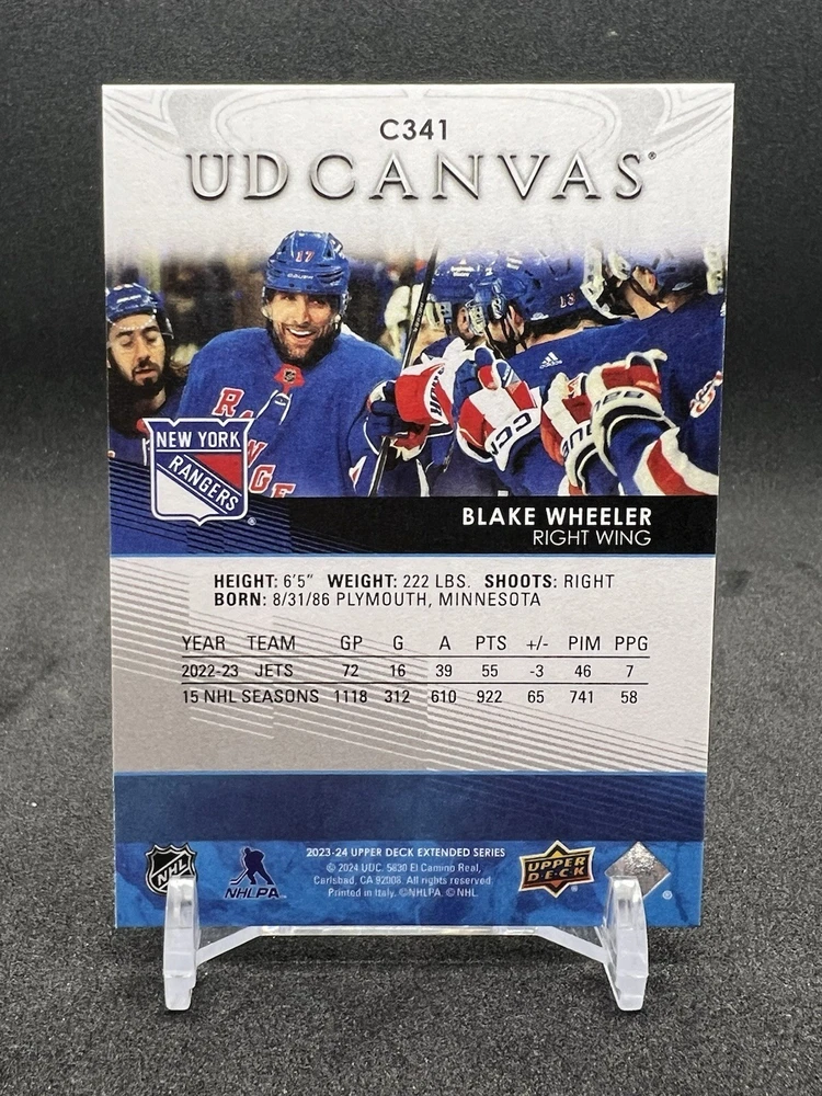 This sports trading card features Blake Wheeler, a player for the National Hockey League (NHL) team New York Rangers. It is part of the 2023-24 Upper Deck Extended Series set and has the card number C341. The card is in excellent shape, near mint or better, and has not been graded. This UD Canvas card is an insert with special features and was manufactured by Upper Deck. It is a great addition to any collection for fans of the sport of hockey. Please note that this card is not autographed and is ungraded.