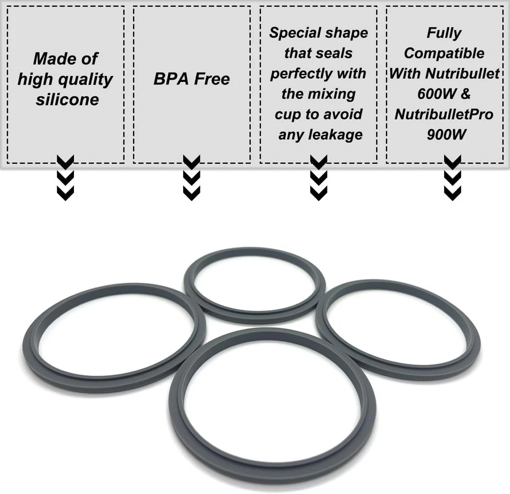 Blender Gasket Replacement Parts, Rubber Ring Seal Rings Blender Accessories for Nutribullet Blender 900W & 600W Series (4 Pieces) 【Compatible】:These blender replacement parts are compatible with NutriBullet Pro 900 watts and 600 watts blender Series. 【High quality material】:Silicone rubber gasket is made of food grade silicone. Seals perfectly, no leakage, durable and suitable for dishwashers. 【Recommendation】:Before replacing the gasket, make sure the worn gasket is removed from the blade! We recommend replacing the extractor blades every 6 months for best performance. 【Size of the replacement gaskets】:Check your seal gasket for a lip (on both sides). Check the size of the blade to be sure.Gasket size for mounting on blade: OD 3.9 inches, ID 3.43 inches, width 0.235 inches. 【Buy with confidence】:This high quality part fitted your blender perfectly and saved your from having to buy a new blender. It works as good as the part it replaced and installation was a breeze.