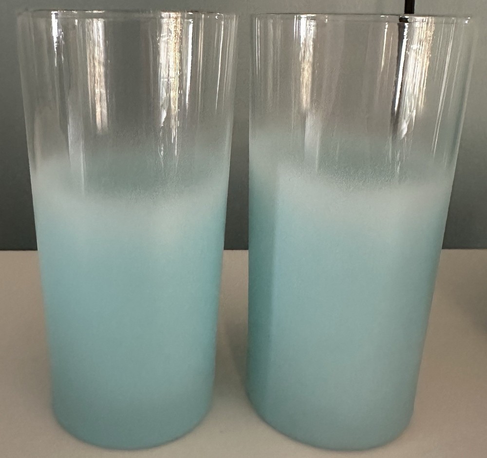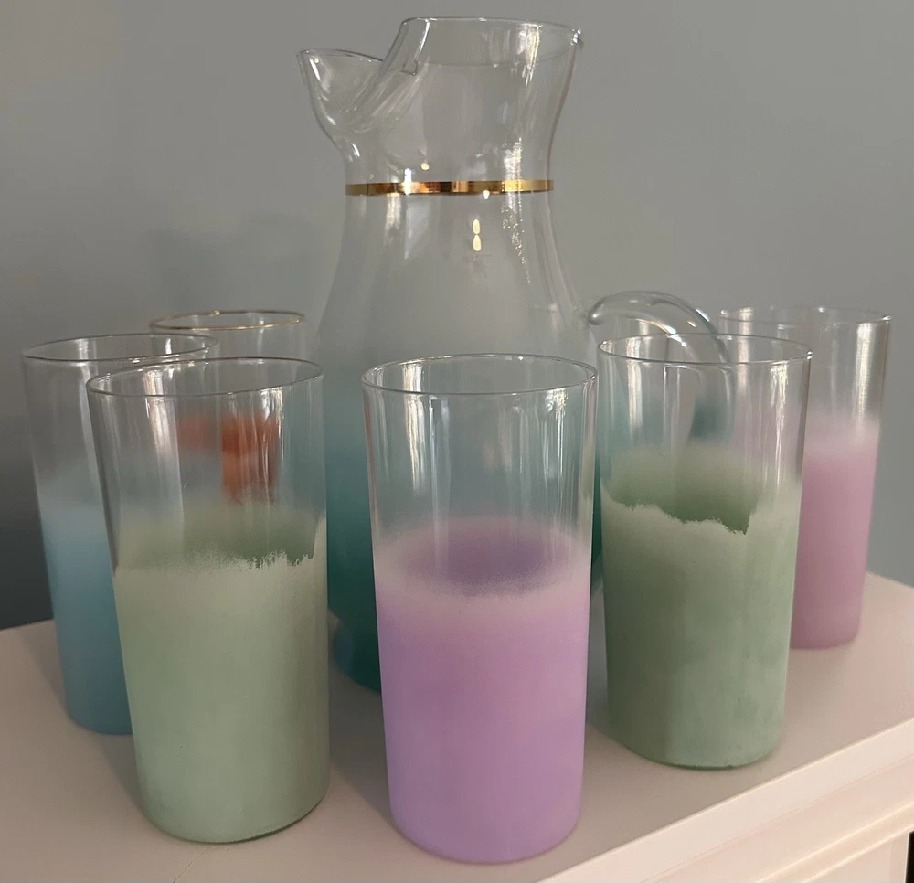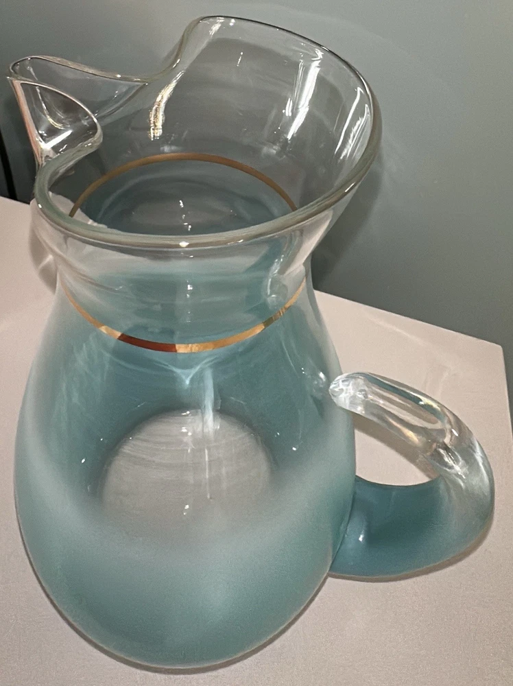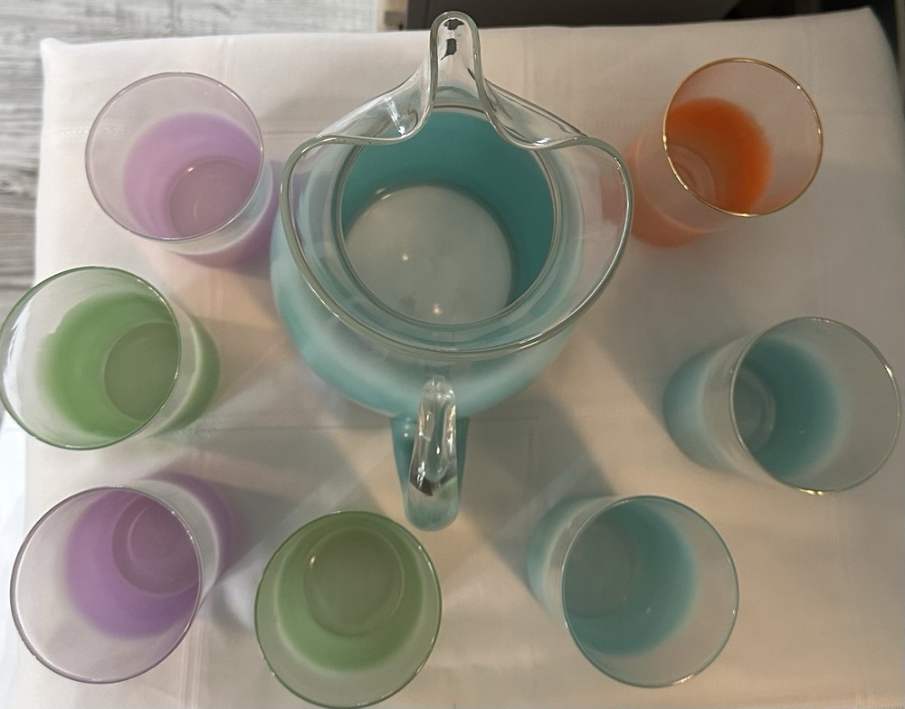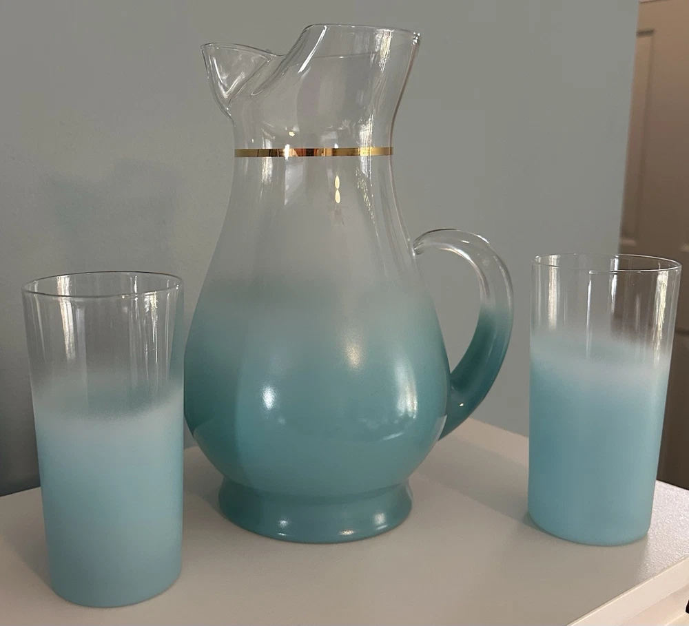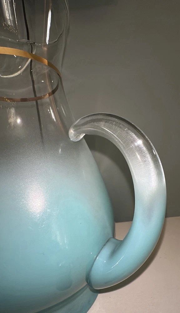 The Blendo MCM Turquoise Pitcher + 7 Glasses set features a mid-century modern design with a frosted pastel color scheme, perfect for all occasions. Made of glass with a vintage style, this original Blendo product line from the 1950s offers a unique and decorative drinking glass set. Ideal for unisex adults, this set is a great addition to any retro-inspired home bar or collection.