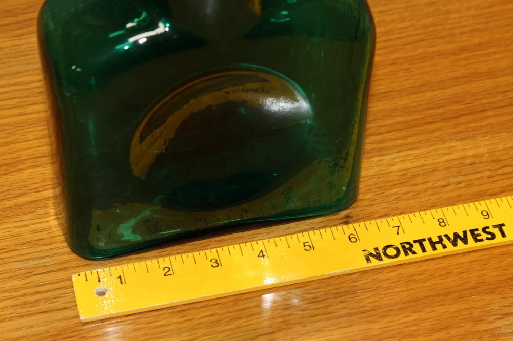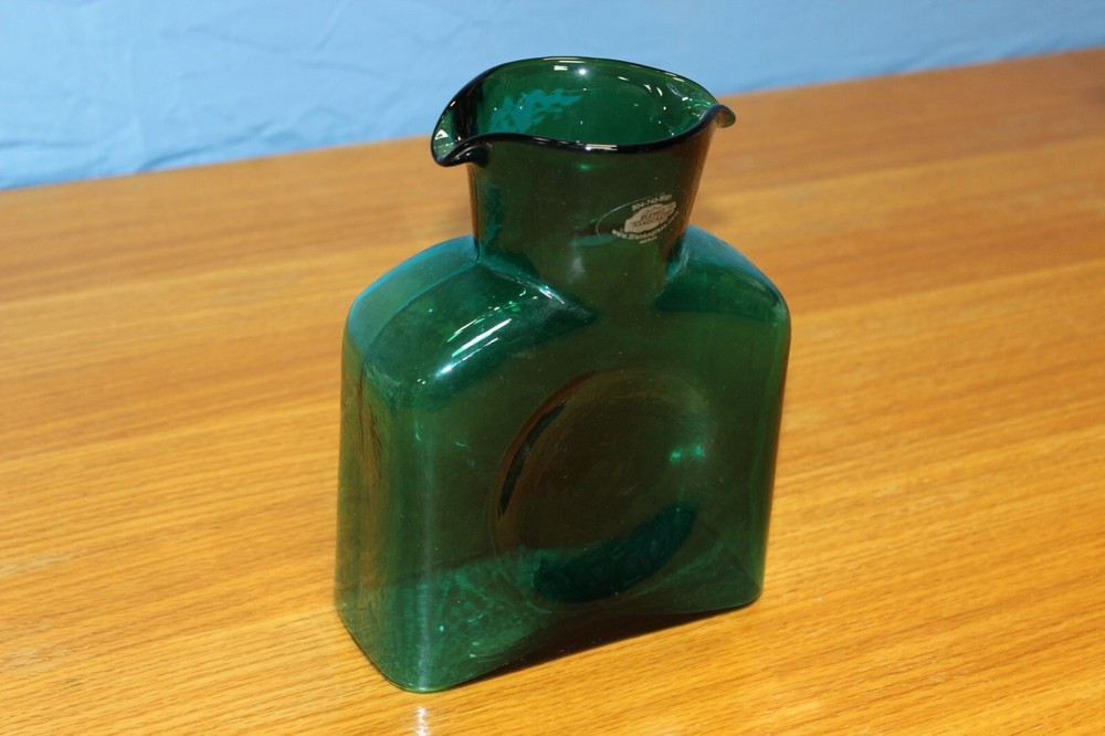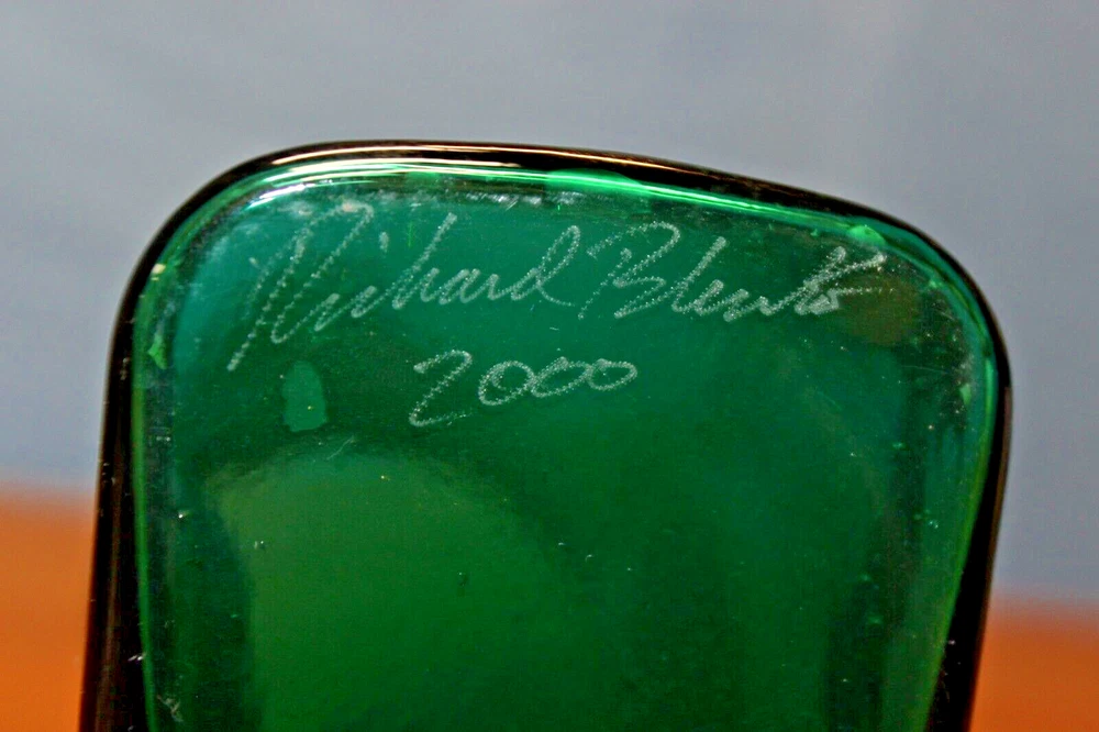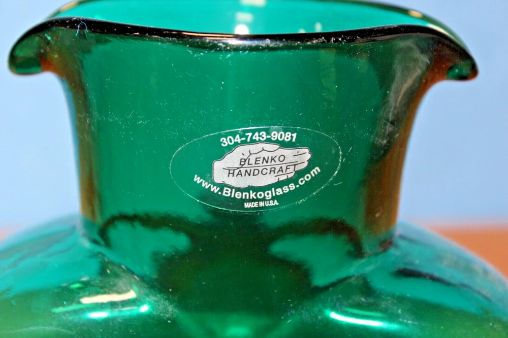 Up for Sale is a Beautiful Handcrafted BLENKO Emerald Green Glass Double Spout Carafe Water Bottle Pitcher Signed Richard Blenko and dated 2000, it also has original sticker. Approximately 8.25" tall with a 3" x 6" base. Approximate capacity of 40 oz. If you have any questions or need more pictures, please contact us BEFORE you purchase. Thank you! Please BE SURE you are buying the correct item for your needs! There are no returns for this item!