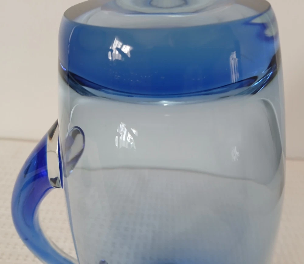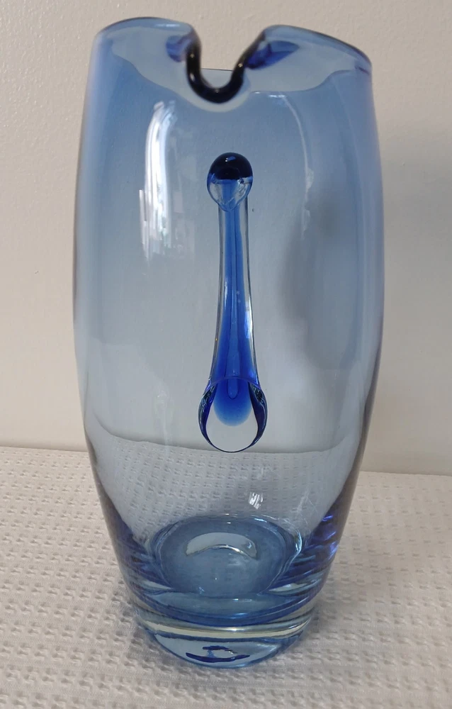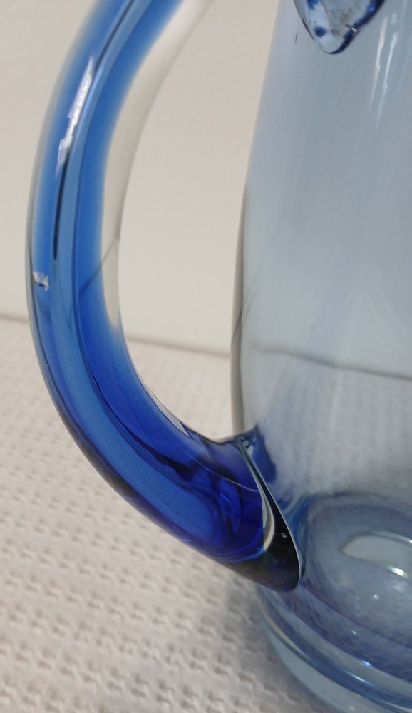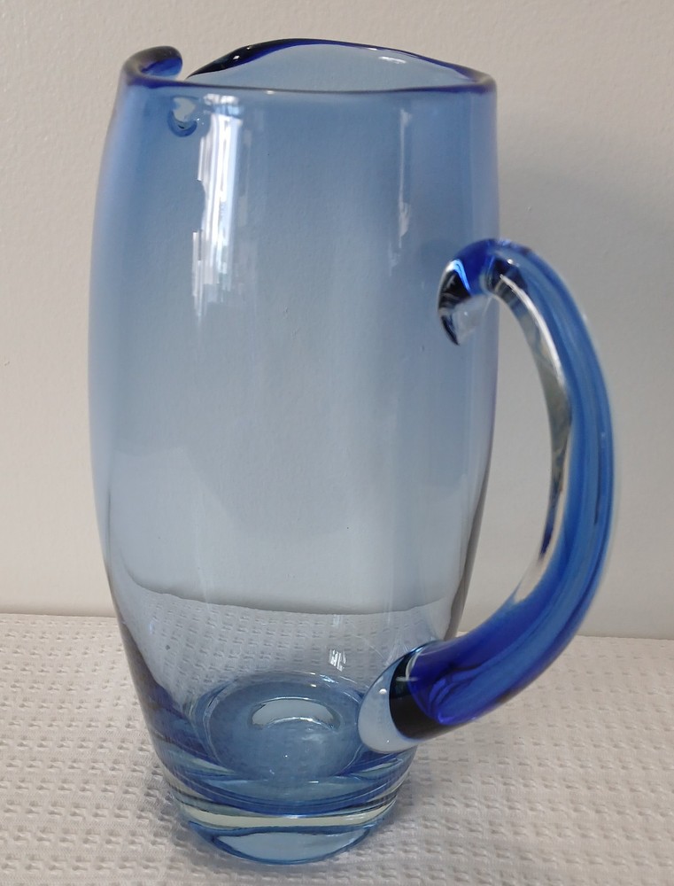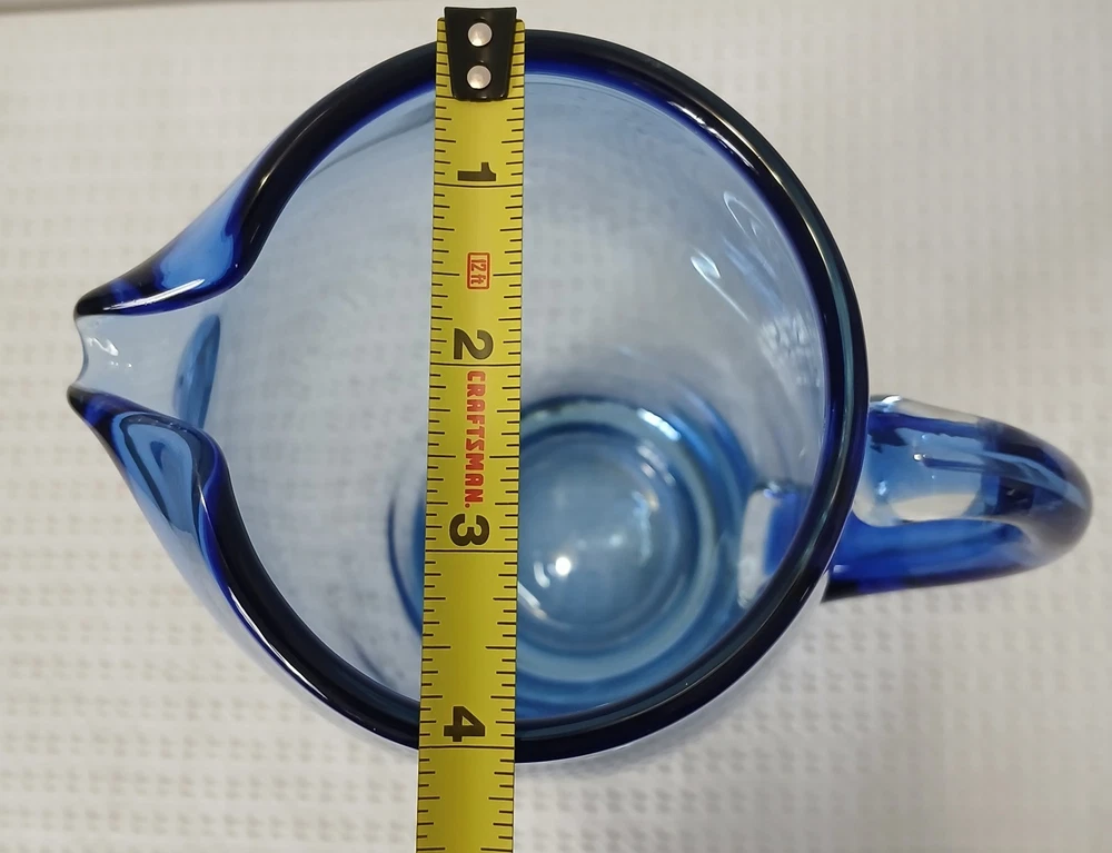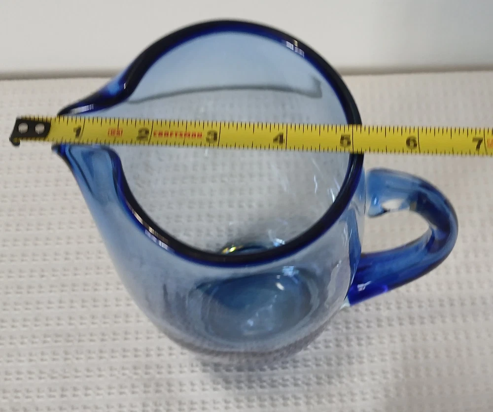 This item is pre-owned, vintage, and possibly antique with no damages chips or cracks. There may be a couple of flea bites and bubbles in the glass as I believe this to be hand-blown it's unmarked but looks to be inspired by Blenko or Bohemia Glass. It's very heavy, weighs about 4 pounds. Approximately 10x8x4 inches. You receive the same pitcher shown. Pictures show all angles and details, and a tape measure for size reference. Carefully packed and shipped to you by the next business day