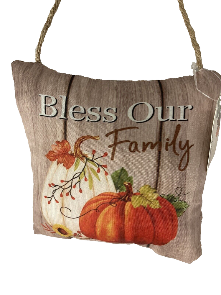 Bless Our Family Fall Door Hanger Pillow Sign - 6x6 Inch Pumpkin Autumn Decor