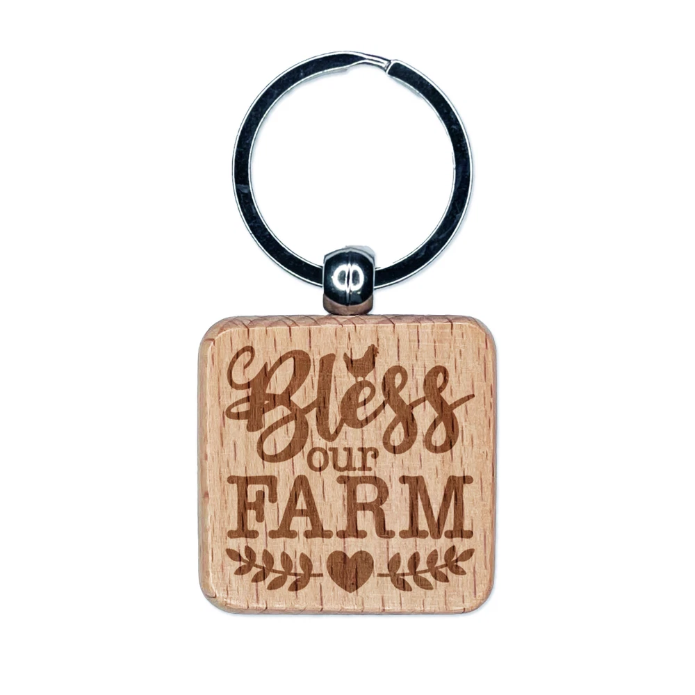 Bless Our Farm Engraved Wood Square Keychain Tag Charm