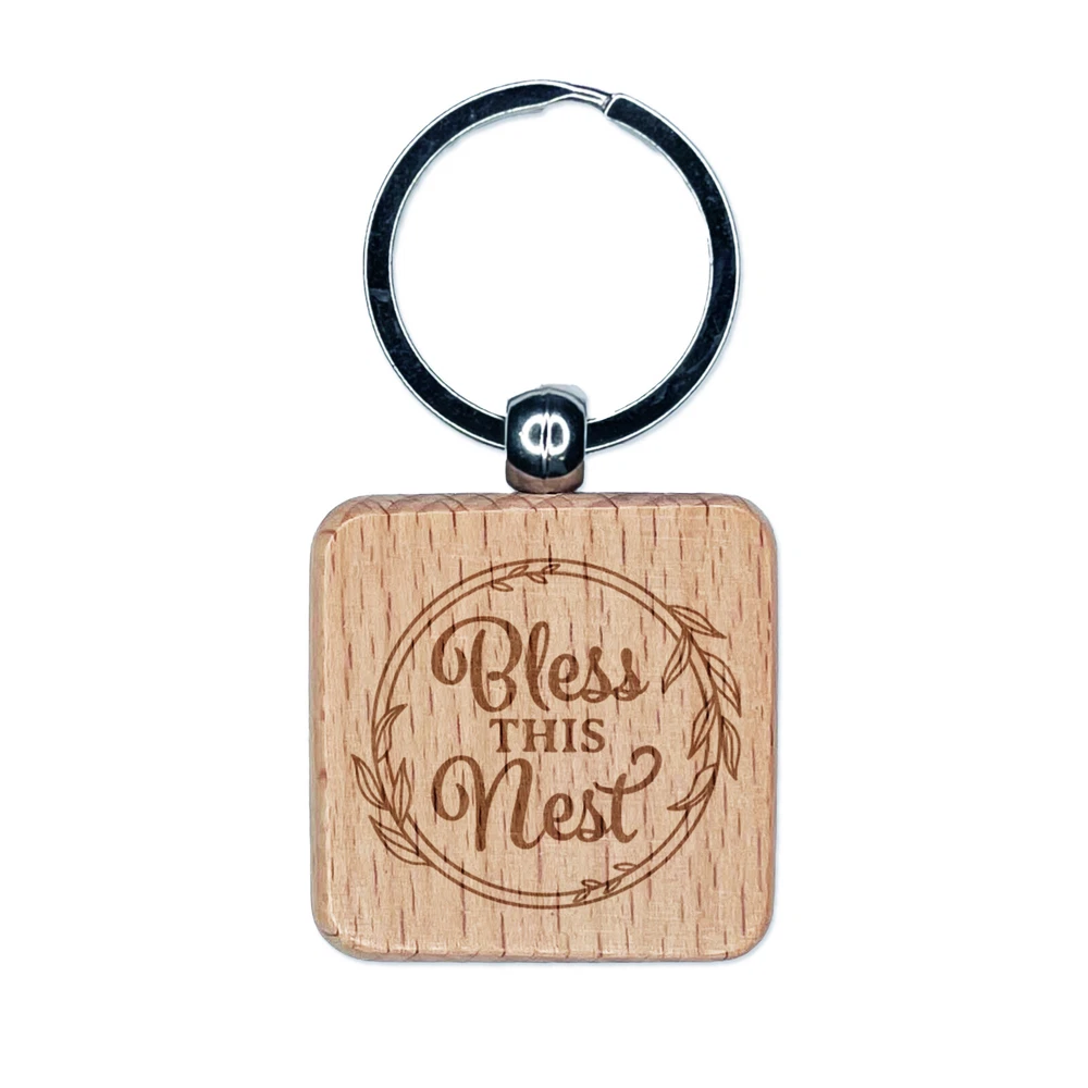 Bless This Nest Leaf Frame Detail Engraved Wood Square Keychain Tag Charm