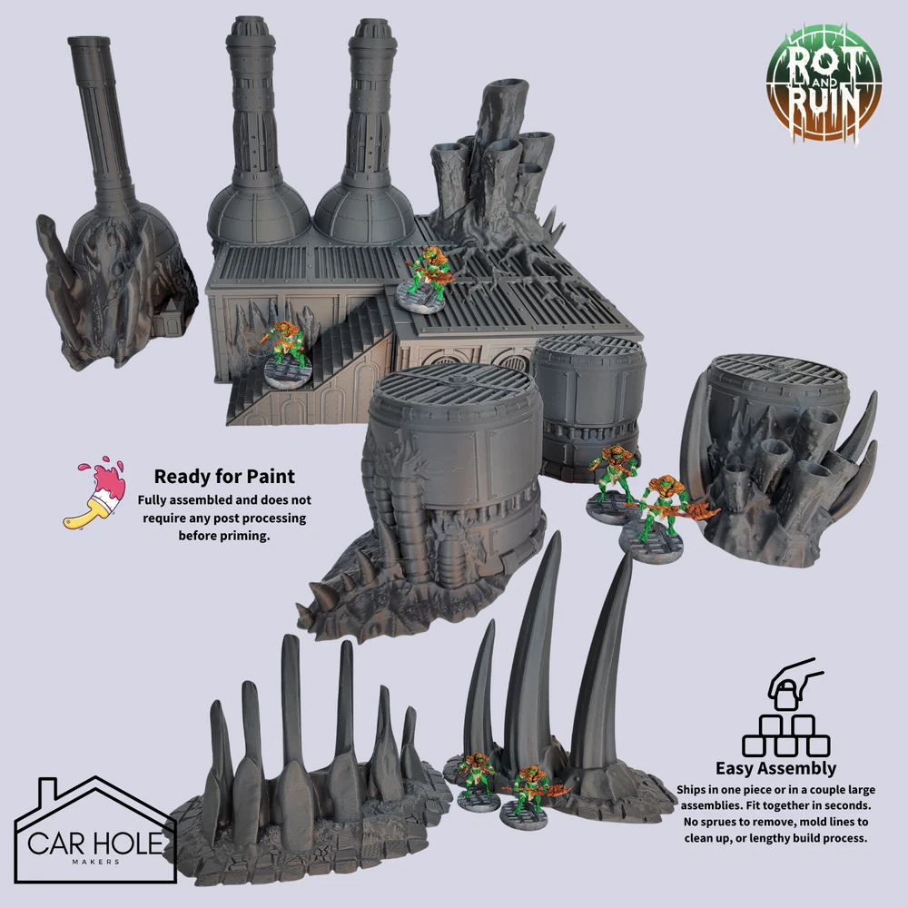 Full Blight World Set: Corrupted Corner Ruins (4 Pieces) Chimneys (2 Pieces) Bone Formations (2 Pieces) Reservoirs (2 Pieces) Models arrive already mostly assembled and ready for play, no glue required. Models come in black PLA and require no clipping, gluing, washing, filing or post processing of any kind. Just grab some hardware store primer and paint with your favorite miniature paints. Some larger pieces are broken down into a few large sub-assemblies for shipping. You may wish to glue these before or after painting to make them more sturdy on the battlefield. Scale. This tabletop scenery is suitable for miniatures 28mm or 32mm in scale. Please note this item is 3D printed. It may have layer lines or other small imperfections caused by the printing process. This item is NOT a Games Workshop product and is not endorsed or affiliated with Games Workshop. This terrain item is designed with the purpose to be compatible with 28mm and 32mm miniatures and miniature role playing game products. All of these ruins were designed by Sacrusmundus and printed under a commercial license.