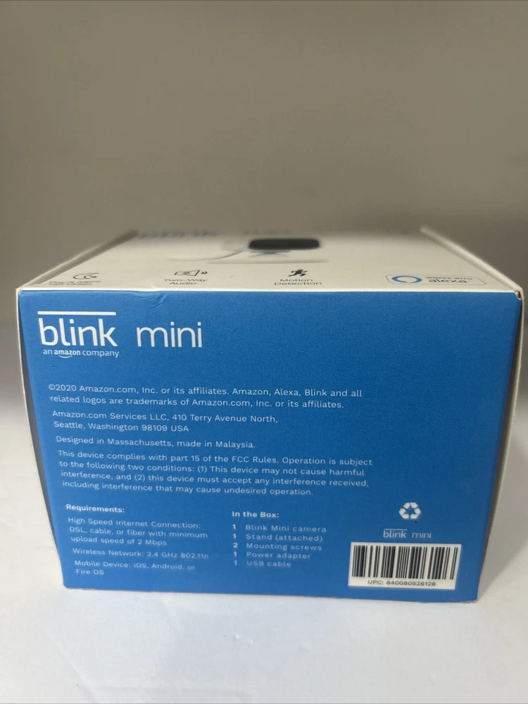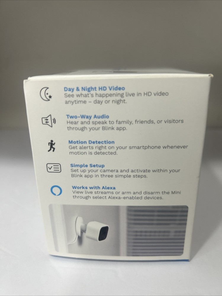 The Blink Mini is a compact indoor smart security camera that plugs in and offers 1080p HD resolution in white. It is equipped with features like a bracket and battery for installation and operation. The camera is compatible with Amazon Alexa for smart home integration and can be controlled wirelessly via Bluetooth, infrared, and Wi-Fi. It is suitable for indoor use and was manufactured in 2020.