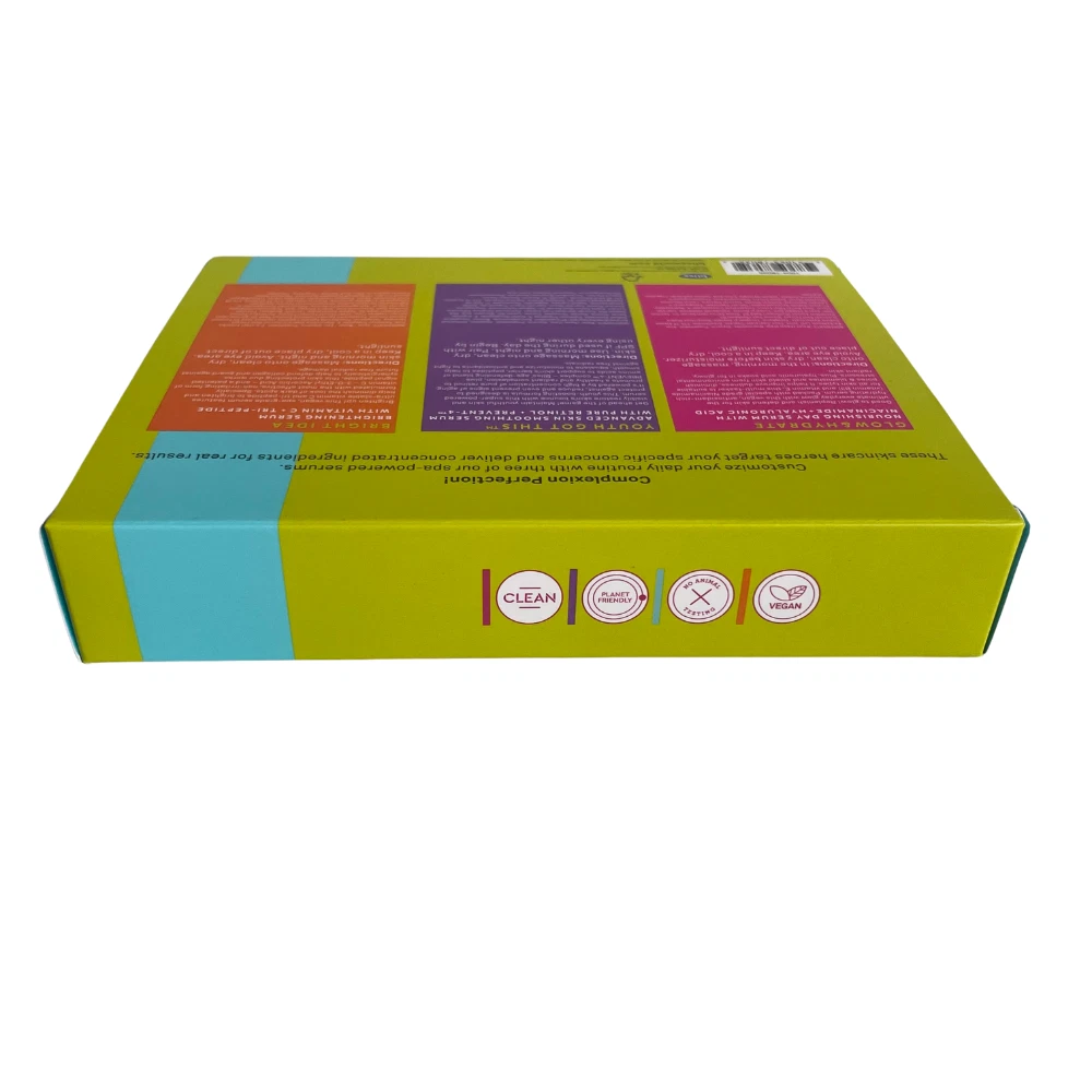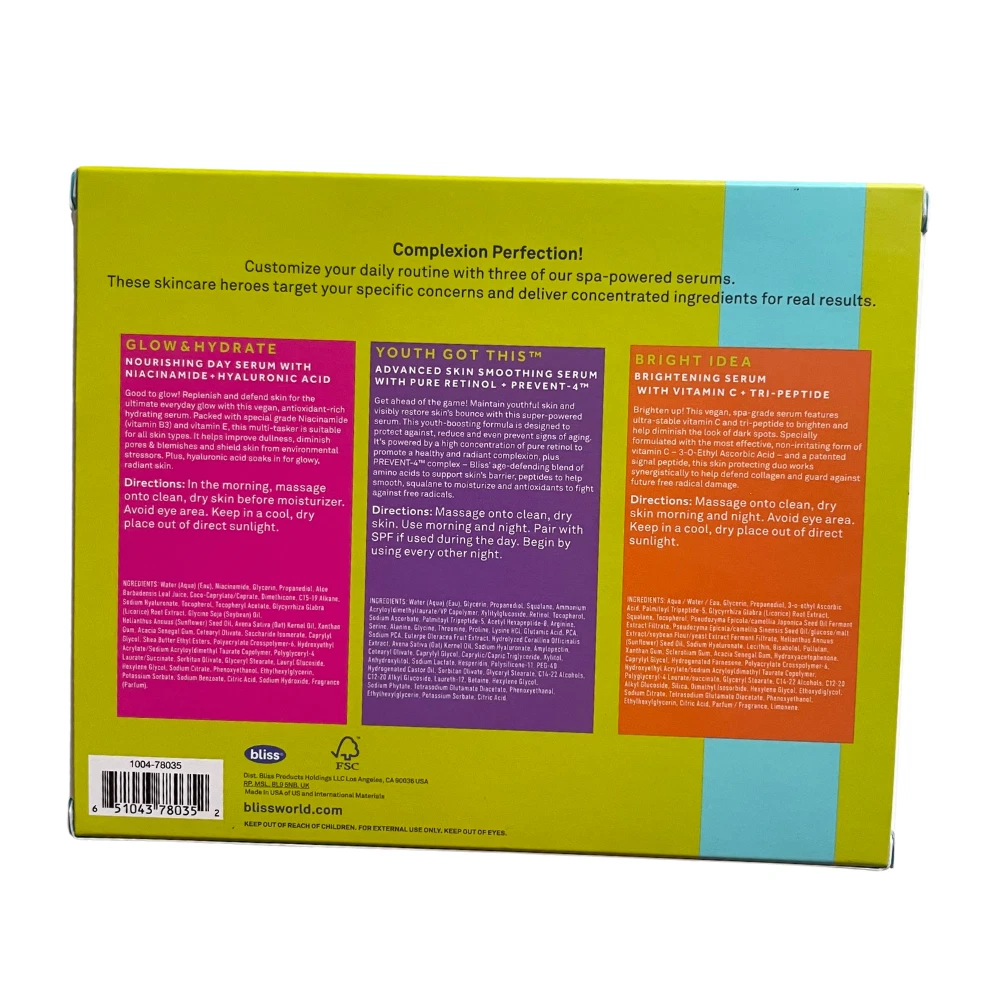 bliss 3 piece Collection Serum Set: Glow & Hydrate Nourishing Day Serum with Niacinamide Hyaluronic AcidYouth got this Advanced Skin Smoothing Serum with Pure Retinol + Prevent -4 Bright Idea Brightening Serum with Vitamin C + Tri-Peptide Three bottles with 0.5 fl oz each