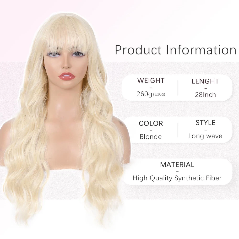 【Wigs Styling】 Long wavy wig is the current trend of women's wigs, which is suitable for all kinds of styling. The bangs that can be trimmed make the wig more slimming to your face shape. This long blonde wavy wig is natural and comfortable to wear, making it easier for you to stay beautiful. 【High Quality Wigs Material】 The blonde wig with bangs is made of 100% high quality heat resistant synthetic fiber, soft, comfortable without odor and not easy to knot. With a hair dryer or curling iron, you can design your favorite style for the blonde wig. Tip:The temperature should be below 150°C. 【Wig Cap Structure】This long blonde wig cap average size (21"-22.5") This size fits most women. There are two elastic bands and clips inside the hair cap, you can adjust the bands according to your head shape and don't have to worry that the wig will fall off. The lightweight and breathable wig cap can make you feel comfortable wearing this blonde wig for women all day long. 【Suitable for Multiple Occasions】This blonde curly wig is suitable for daily use, it can also allow you to attract attention at parties, vacations, graduations, music festivals. You can wear this long wave blonde wig with bangs to weddings, Halloween, fashion shows, anywhere you want to go, you can also give it as a gift to your friends, family. 【After-sale Service】If you have any questions with this long blonde hair wig, please feel free to contact us. we will reply within 24 hours.we are happy to serve you to help you solve the problem.
