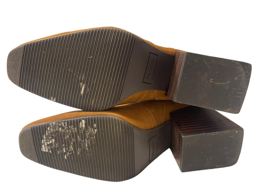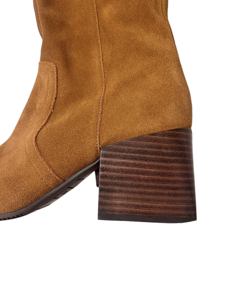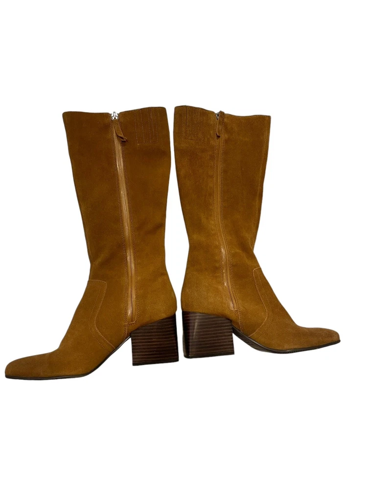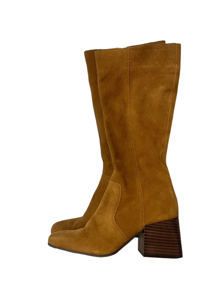 In excellent condition Waterproof suede upper Inside zipper closure Square toe Synthetic lining Fabric footbed Approx. 14" shaft height Approx. 12" calf circumference 2.75" stacked block heel Rubber sole