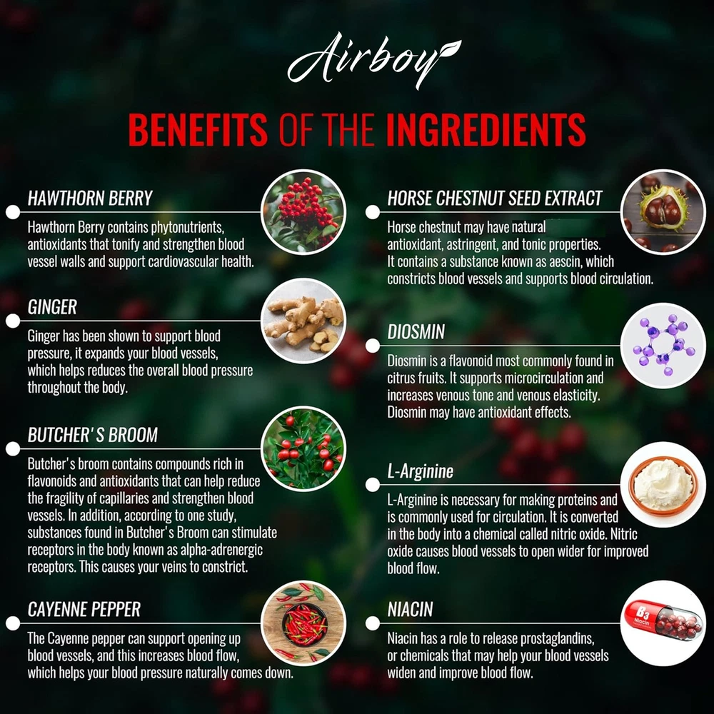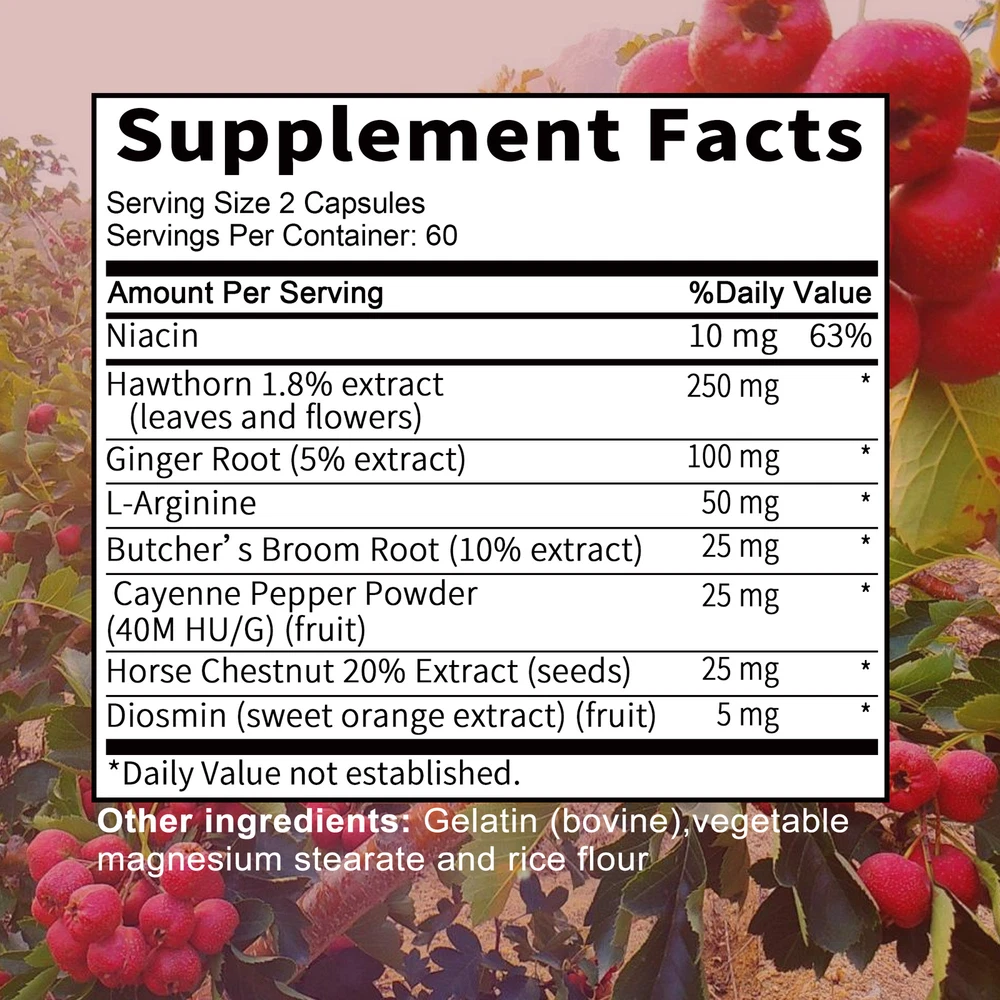 Effects: Cardiovascular Health,Heart Health Ingredients: Hawthorn, Ginger Root, Cayenne Pepper Directions: Take 2 capsules once daily after a meal. Shipping: Ships within 48 hours on working days. Shelf life: 2 years Description: Our Blood Flow Care supplement acts as a nitric oxide booster to help reduce muscle cramps, fatigue, varicose veins. Blood Flow Care can enhance leg, heart and cardiovascular health while giving you more stamina to stay active. A better circulatory system can enhance energy and vitality in the body. Document