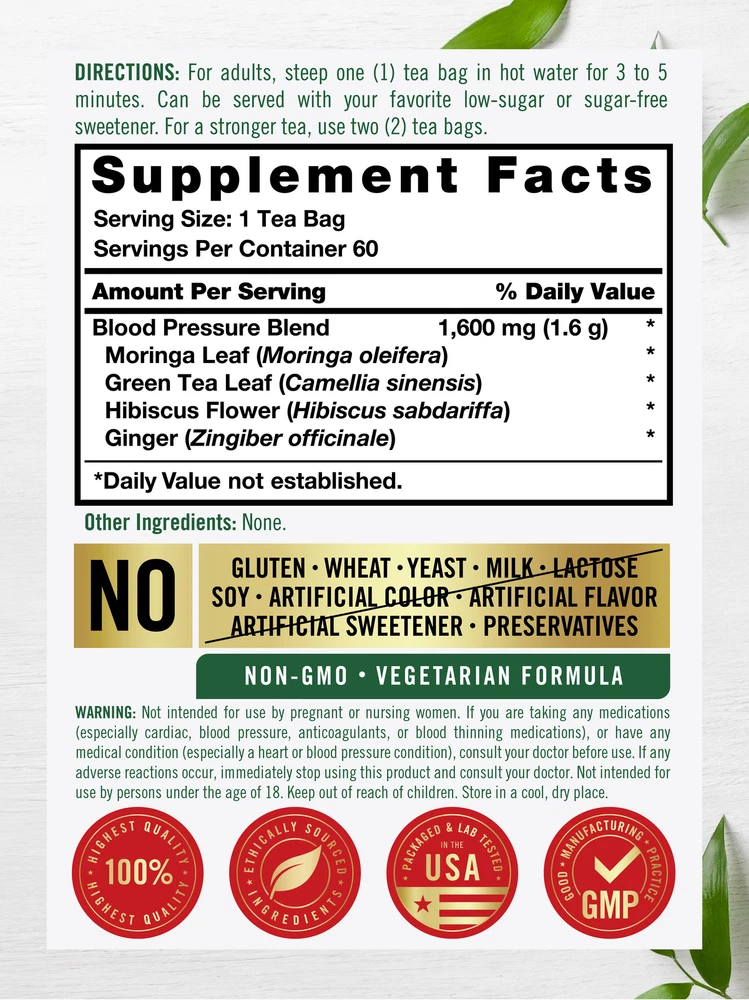 Celebrating Tradition with Herbal Tea: There’s nothing more refreshing than a warm cup of herbal tea to help you unwind. Enjoyed for centuries dating back to the Shang Dynasty in China, tea is still one of the most popular beverages around the globe. At Carlyle, we celebrate this ancient tradition by bringing you a fresh assortmnet of premium, flavorful teas with ingredients from all over the world! Carlyle Blood Pressure Support Tea:* Carlyle Blood Pressure Support Tea is made with a medley of herbs that help maintain blood pressure levels already within a normal range.* Our vegetarian formula features a 1,600 mg blend of Hibiscus Flower, Mulberry, Moringa and Green Tea that are rich in botanical compounds and naturally occuring antioxidants, providing powerful nutritional benefits in each cup! Rooted in Wellness: Our expertise in sourcing the purest ingredients combined with advanced technologies makes us proud to deliver premium, honest supplements at the best value. Carlyle Blood Pressure Tea is a testament to our commitment to excellence, made with powerful ingredients rooted in wellness.* Thanks for choosing us in your pursuit of living healthy.