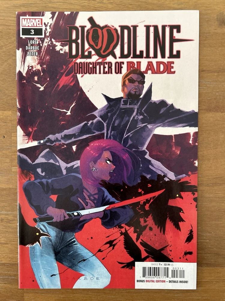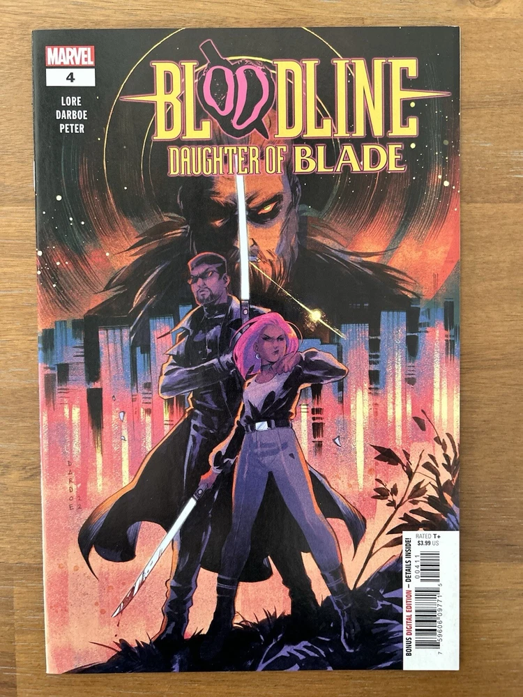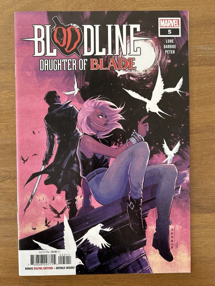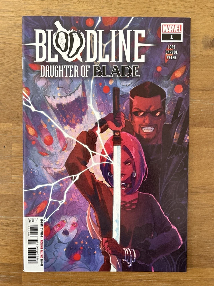 Bloodline: Daughter of Blade #1-5 is a complete set of Marvel comics featuring the characters Bloodline and Blade. The series, set in the Marvel Universe, is written by Cris Peter, Danny Lore, and Karen S. Darboe. This mixed lot of comic books includes issues from 2023 in English language, with color illustrations and features such as First Printing and Key Issue. The comic book lot is intended for a general audience and falls under genres like Action, Superheroes, and Adventure.