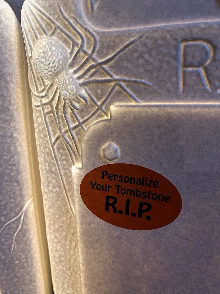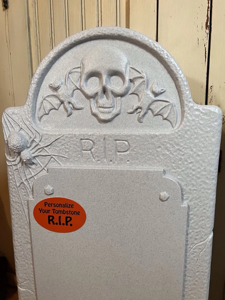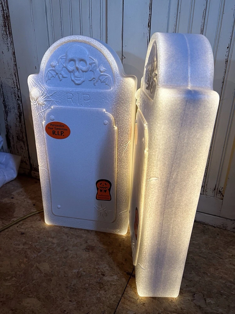 PAIR. Two Gravestone Tombstones from Union Products and created by Don Featherstone. Each one comes with a bright LED light bulb and cord. Each one measures 25” inches tall, 12” inches wide, and 4 1/2” inches thick. Each quantity listed is for two Gravestones. Shipped UPS or FED Ex. No PO Box shipping. Look over pictures to help with description. Thanks.