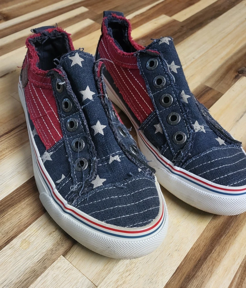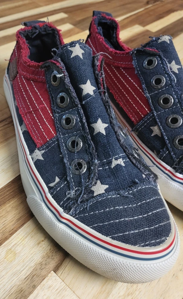 Elevate your shoe collection with these patriotic Blowfish Malibu canvas slip-on sneakers. Featuring a flag pattern, distressed frayed detailing, and a navy star design, these sneakers are perfect for activewear or casual occasions. The slip-on closure and athletic style make them ideal for summer, fall, and spring seasons. With a US shoe size of 6.5, they are designed for women who love to flaunt their sense of style. Add these sneakers to your wardrobe today and let your feet do the talking!
