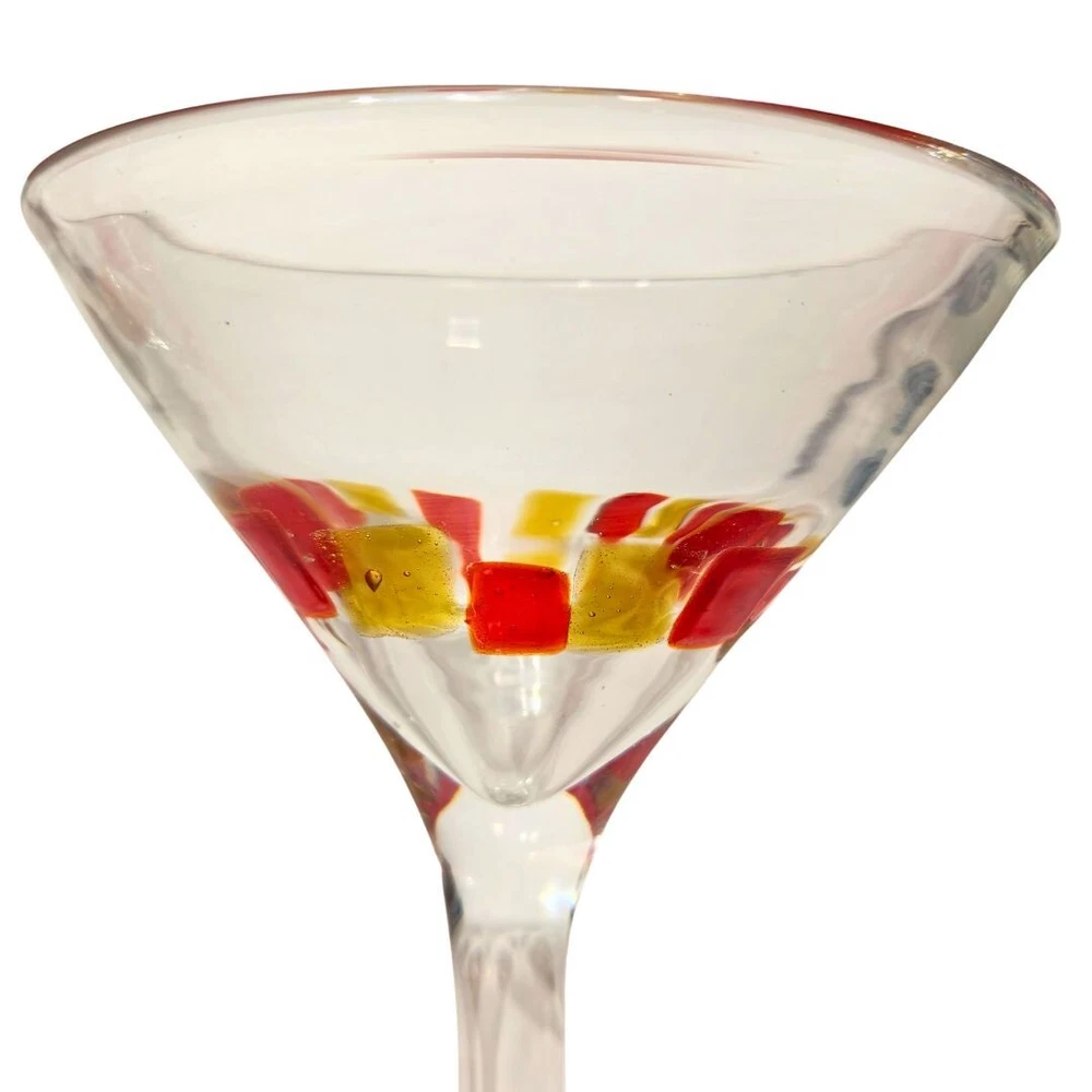 Blown Martini Glass Clear Stemmed 6.5" Wide Rim Applied Yellow Red Lot of 2 No chips or cracks, but glasses have been used and may present minor scratches and signs of wear. Applied red and yellow squares are done by hand and are not perfectly uniform. Please thoroughly review photos for quality and condition of item. If you have any questions, feel free to reach out.
