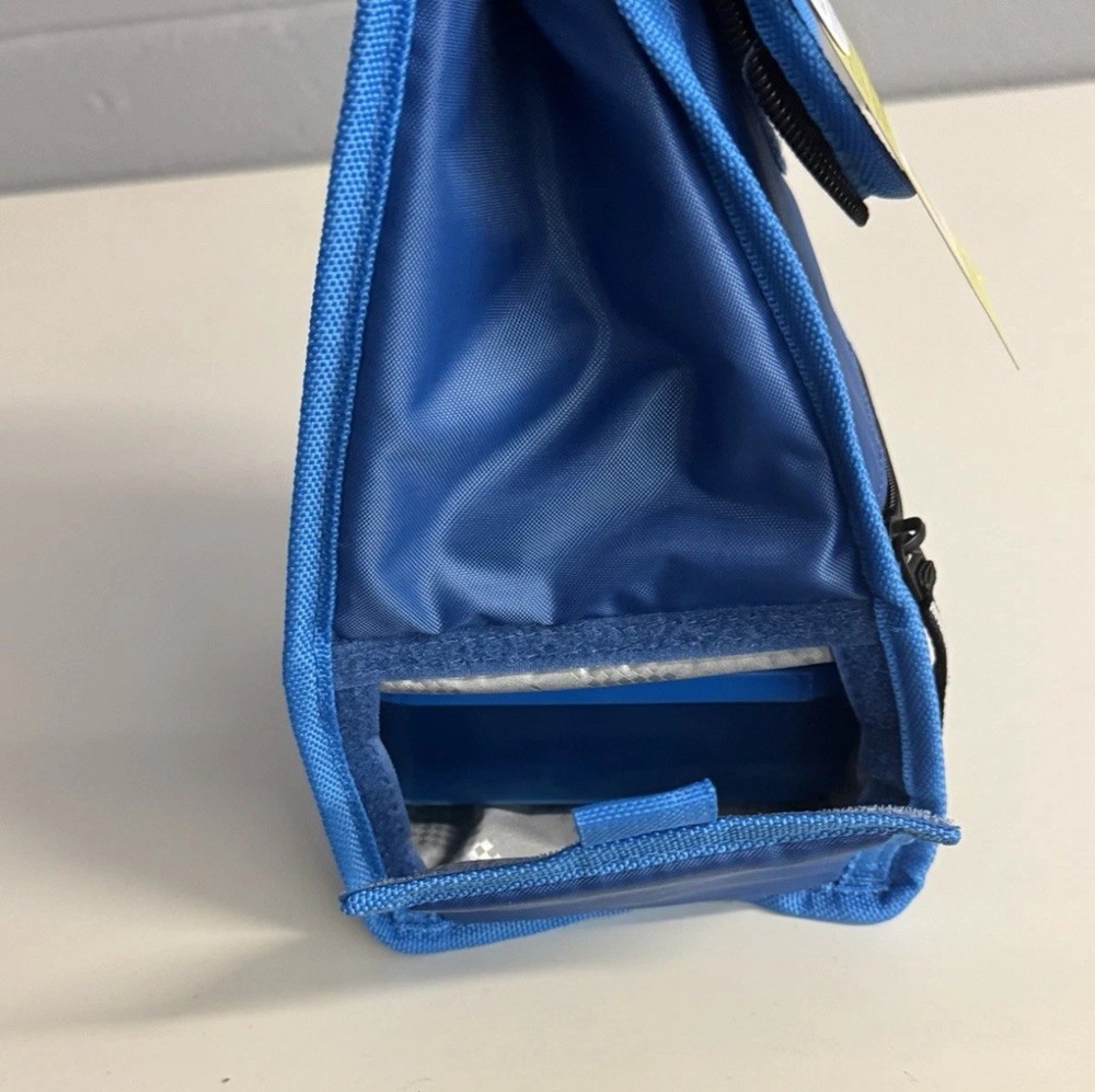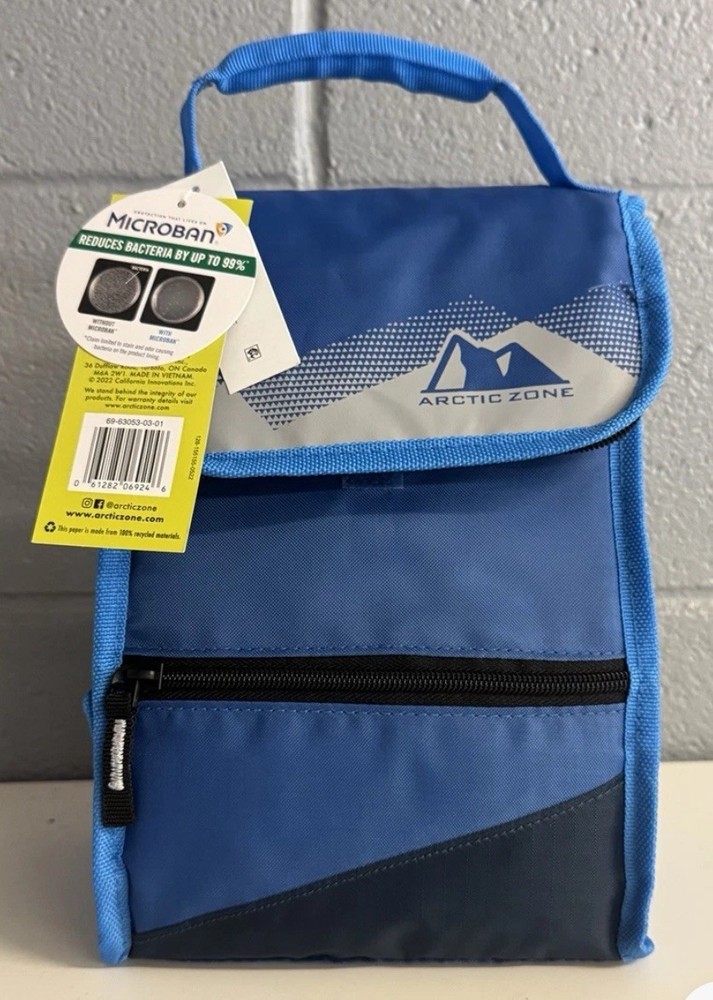 The Blue Arctic Zone Insulated Lunch Bag is a BPA-free food container featuring dual closure with a flap or zipper for secure access. With a color block pattern and black trim, this rectangular shaped lunch bag includes a 22-oz food container perfect for kids. Made from fabric and acrylic materials, this traditional style lunch bag also includes features like a handle, easy cleaning, and expandable design for added convenience. The BPA-free container and zinc technology ensure your food stays fresh while keeping you worry-free about harmful chemicals.