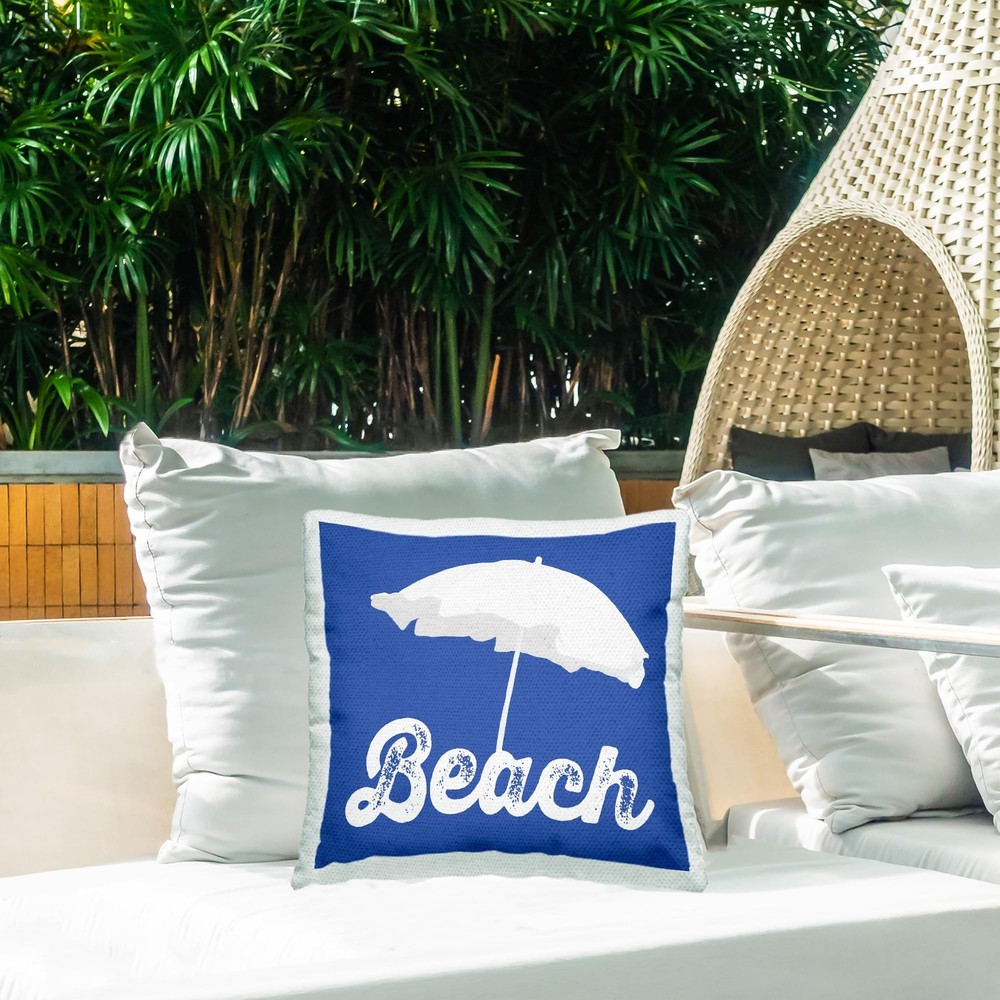 Dimensions: 18 x 18 Inches, Including Filling Insert Decorative outdoor pillows are a great and easy way to decorate your outdoor living space, adding both a decorative accent and comfort. Pillows arrive with insert already zipped inside and ready to fluff. Casing and filling insert are both made of quick-dry soft polyester material. The printing process makes the ink part of the fabric for greater outdoor durability. To wash remove filling insert from casing using invisible zipper. Clean pillow case separately, machine wash on delicate with cold water and mild detergent. For best quality hang dry. Pillow insert is spot clean only. Artwork Relates To: Beach Umbrella, Blue, Coastal, Summer, Beach Design by Graffi*Tee Studios
