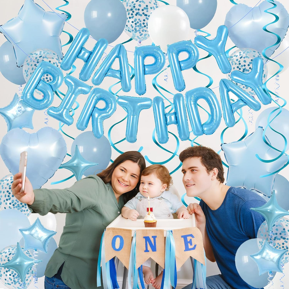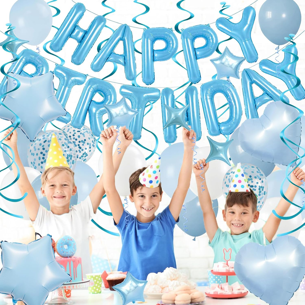 Light Blue and White Birthday Decorations: esigned in soft light blue tones to create a dreamy, cool, and charming making it irresistible for boys, girls, men, women, birthdays, bachelor parties, or any celebration suitable for all ages and occasions leaving an unforgettable impression at just one glance Easy to Use: You can hang the happy birthday banners and hanging swirls on walls, in rooms, outdoor courtyards, classrooms, trees, fireplaces, doorways, and curtains to create stunning photo backgrounds. Inflating balloons to about 90% will help them last longer. To make the confetti balloons sparkle, rub them with your hair after inflation to create static electricity Package includes: 1pc 16inch light blue foil “Happy Birthday” banner, 6pcs dusty blue birthday balloons, 4pcs white latex balloons, 4pcs light blue latex balloons, 4pcs blue confetti balloons(Each balloon is 12 inches), 2pcs 18inch baby blue star foil balloons, 2pcs 18inch baby blue heart balloons, 3pcs 10inch light blue star balloons, 3pcs 10inch light blue four-pointed star balloons, 6pcs light blue hanging swirls, 2pcs ribbons, 1pcs dot glue High-Quality Materials: Made from shiny premium Mylar foil, our birthday banner keeps its shape and stays inflated longer without leaking. These tough balloons are reusable—just deflate, store, and get ready to party again! Brighten up every celebration with decorations that last and dazzle. Customer Service: We are committed to providing top-quality products and ensuring your satisfaction. If you're not completely happy with this baby blue happy birthday decorations, feel free to contact us for a solution. Foil Balloons Birthday Decorations