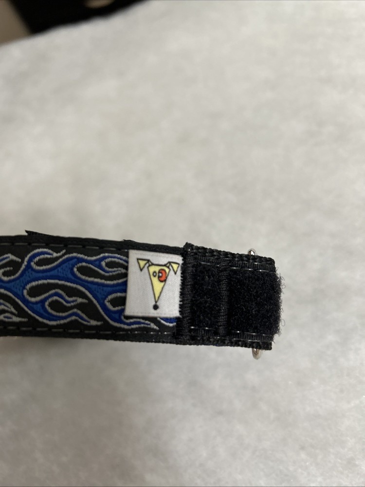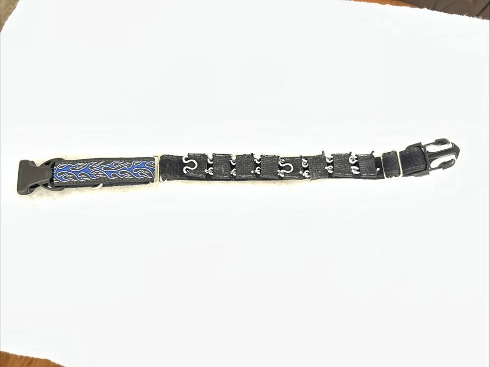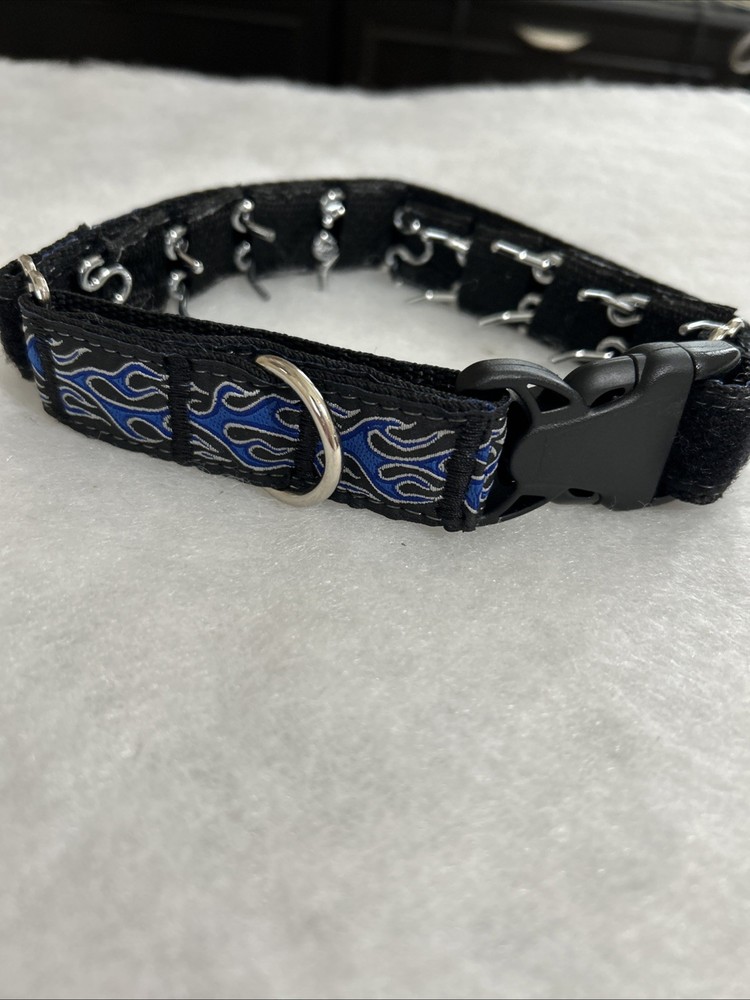 Dog Prong Collar Blue Black Silver Fire Design All Hound Apparel Size 1 inch wide Medium, approx. 16 to 17 inches long. It doesn't get any larger than 17 inches total. The prongs are detachable so you can use just a few or all and taper down to just a few and then none. This collar does have a snap clip entry to get it on and off, it does not have to go over your dogs head. It is a martingale type collar, which means it gets tighter on the dogs neck if they pull, preventing them from backing out of the collar. It is new, very clean, never used, I purchased two and only need one. Original Owner. Please see all photos. Shipping to USA only. Sold “as is”. TERMS OF SALE.Payment is expected at end of sale. Item will be mailed within 24 hours from time of received cleared payment. Everything will be securely packaged and sent from a smoke free home. Thank you for checking out our treasures. We strive for a five star transaction.