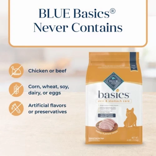 Important Note for Our Valued Customers: To offer you the best prices with free shipping, we occasionally experience shipping delays. If this happens, we’ll notify you immediately, issue a full refund, and invite you to place a new order at your convenience. To keep costs low, we sometimes reuse branded packaging boxes for shipments—we appreciate your understanding if you receive your order in repurposed packaging. Rest assured, all products we sell are 100% brand new, unopened, and freshly manufactured, including pet food and human-grade items, with a minimum 8-month shelf life remaining. If any issues arise, please contact us first—we’re committed to resolving them quickly. If you’re not completely satisfied, we offer a full refund with no hassle. Thank you for your trust and support! Description BLUE Basics Dog Food is a delicious, limited-ingredient diet made from fewer ingredients selected with care, that may prove helpful to dogs with food sensitivities. All BLUE Basics recipes start with real meat from a single animal protein source not often used in dog food, plus they include pumpkin and easily digested carbohydrates. BLUE Basics Dog Food is a product of the Blue Buffalo company. Based in the United States, Blue Buffalo makes premium-quality pet foods featuring real meat, fruit and vegetables. highlights STARTS WITH REAL TURKEY: A recipe that starts with real turkey as the first ingredient, this adult dry dog food features a single animal protein source along with potatoes, peas and pumpkin to support gentle digestion, making it a good option for dogs with a sensitive stomach. LIMITED INGREDIENT HEALTHY WEIGHT DOG FOOD: BLUE Basics is a limited ingredient dog food that doesn’t contain any chicken, beef, corn, wheat, soy, dairy or eggs making it a good option for dogs with food sensitivities. Plus, it’s formulated with reduced calories from fat to help your dog achieve and maintain an ideal body weight. WITH LIFESOURCE BITS: This formula contains BLUE’s exclusive LifeSource Bits® – a precise blend of antioxidants, vitamins and minerals carefully selected by holistic veterinarians and animal nutritionists to support immune system health, life stage requirements, and a healthy oxidative balance. NATURAL DOG FOOD: BLUE dry dog food is formulated for the health and well-being of your dog and features the finest natural ingredients enhanced with vitamins and minerals. It never contains chicken (or poultry) by-product meals, corn, wheat, soy, artificial flavors or preservatives. Contains (1) 4lb bag of BLUE Basics Limited Ingredient Diet, Natural Adult Healthy Weight Dry Dog Food, Turkey & Potato