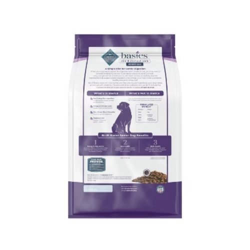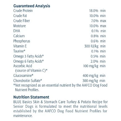 Important Note for Our Valued Customers: To offer you the best prices with free shipping, we occasionally experience shipping delays. If this happens, we’ll notify you immediately, issue a full refund, and invite you to place a new order at your convenience. To keep costs low, we sometimes reuse branded packaging boxes for shipments—we appreciate your understanding if you receive your order in repurposed packaging. Rest assured, all products we sell are 100% brand new, unopened, and freshly manufactured, including pet food and human-grade items, with a minimum 8-month shelf life remaining. If any issues arise, please contact us first—we’re committed to resolving them quickly. If you’re not completely satisfied, we offer a full refund with no hassle. Thank you for your trust and support! Description BLUE Basics Turkey and Potato Recipe for Senior Dogs is a deliciously simple limited-ingredient diet for skin and stomach care. It’s designed to support healthy skin and gentle digestion. This dry dog food starts with real turkey as its only animal protein source and contains no corn, wheat, soy, dairy, or eggs, making it ideal for dogs with food sensitivities. This BLUE Basics formula contains Glucosamine and Chondroitin to support your senior dog’s joint function and overall mobility. Like all BLUE dry foods, BLUE Basics includes exclusive antioxidant-rich LifeSource Bits, which are “cold-formed” to retain their potency. Give your dog the balanced nutrition of BLUE Basics today. BLUE Basics is brought to you by Blue Buffalo, the leader in natural pet food. Blue Buffalo makes premium-quality pet foods featuring real meat first, wholesome whole grains, and healthy fruits and vegetables. Love them like family. Feed them like family. highlights STARTS WITH REAL TURKEY: A recipe that starts with real turkey as the first ingredient, this dry dog food features a single animal protein source along with potatoes, peas and pumpkin to support gentle digestion in senior dogs LIMITED INGREDIENT SENIOR DOG FOOD: BLUE Basics is a limited ingredient diet that doesn’t contain any chicken, beef, corn, wheat, soy, dairy or eggs making it a good option senior dogs with food sensitivities ANTIOXIDANT-RICH LIFESOURCE BITS: A precise blend of antioxidants, vitamins and minerals carefully selected by holistic veterinarians and animal nutritionists to support immune system health, life stage needs and a healthy oxidative balance A NATURAL DOG FOOD: BLUE dry dog food is made with the finest natural ingredients enhanced with vitamins and minerals; BLUE contains NO chicken (or poultry) by-product meals, corn, wheat, soy, artificial flavors or preservatives PACKAGING MAY VARY: Contains one (1) 4lb bag of BLUE Basics Skin & Stomach Care, Natural Senior Dry Dog Food, Turkey & Potato Ingredients: deboned turkey, oatmeal, brown rice, potatoes, peas, turkey meal, pea fiber, natural flavor, pea protein, canola oil (source of omega 6 fatty acids), fish oil (source of dha-docosahexaenoic acid), calcium carbonate, dicalcium phosphate, potassium chloride, choline chloride, pumpkin, dried chicory root, direct dehydrated alfalfa pellets, flaxseed (source of omega 3 fatty acids), alfalfa nutrient concentrate, salt, taurine, vitamin e supplement, preserved with mixed tocopherols, l-ascorby1-2-polyphosphate (source of vitamin c), dl-methionine, glucosamine hydrochloride, zinc amino acid chelate, zinc sulfate, vegetable juice for color, ferrous sulfate, iron amino acid chelate, blueberries, cranberries, barley grass, parsley, turmeric, dried kelp, yucca schidigera extract, niacin (vitamin b3), calcium pantothenate (vitamin b5), copper sulfate, l-lysine, biotin (vitamin b7), vitamin a supplement, copper amino acid chelate, manganese sulfate, manganese amino acid chelate, thiamine mononitrate (vitamin b1), riboflavin (vitamin b2), vitamin d3 supplement, vitamin b12 supplement, pyridoxine hydrochloride (vitamin b6), calcium iodate, dried yeast, dried enterococcus faecium fermentation product, dried lactobacillus acidophilus fermentation product, dried aspergillus niger fermentation extract, dried trichoderma longibrachiatum fermentation extract, dried bacillus subtilis fermentation extract, folic acid (vitamin b9), sodium selenite, oil of rosemary.