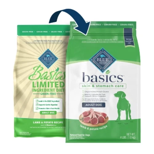 Important Note for Our Valued Customers: To offer you the best prices with free shipping, we occasionally experience shipping delays. If this happens, we’ll notify you immediately, issue a full refund, and invite you to place a new order at your convenience. To keep costs low, we sometimes reuse branded packaging boxes for shipments—we appreciate your understanding if you receive your order in repurposed packaging. Rest assured, all products we sell are 100% brand new, unopened, and freshly manufactured, including pet food and human-grade items, with a minimum 8-month shelf life remaining. If any issues arise, please contact us first—we’re committed to resolving them quickly. If you’re not completely satisfied, we offer a full refund with no hassle. Thank you for your trust and support! Description BLUE Basics Dog Food is a delicious, limited-ingredient diet made from fewer ingredients selected with care, that may prove helpful to dogs with food sensitivities. All BLUE Basics recipes start with real meat from a single animal protein source not often used in dog food, plus they include pumpkin and easily digested carbohydrates. highlights STARTS WITH REAL LAMB: A recipe that starts with real lamb as the first ingredient, this adult dry dog food features a single animal protein source along with potatoes, peas and pumpkin to support gentle digestion in your dog without the grains that contain gluten, making it a good option for dogs with a sensitive stomach. LIMITED INGREDIENT DOG FOOD: BLUE Basics is a limited ingredient grain free dog food that doesn’t contain any chicken, beef, corn, wheat, soy, dairy or eggs making it a good option for dogs with food sensitivities. Plus, it’s specifically formulated with essential proteins and carbohydrates to help meet energy requirements and promote a healthy lifestyle. WITH LIFESOURCE BITS: This formula contains BLUE’s exclusive LifeSource Bits® – a precise blend of antioxidants, vitamins and minerals carefully selected by holistic veterinarians and animal nutritionists to support immune system health, life stage requirements, and a healthy oxidative balance. NATURAL DOG FOOD: BLUE dry dog food is formulated for the health and well-being of your adult dog and features the finest natural ingredients enhanced with vitamins and minerals. It never contains chicken (or poultry) by-product meals, corn, wheat, soy, artificial flavors or preservatives. Contains (1) 4lb bag of BLUE Basics Limited Ingredient Diet, Grain Free Natural Adult Dry Dog Food, Lamb & Potato